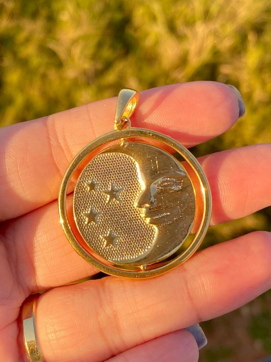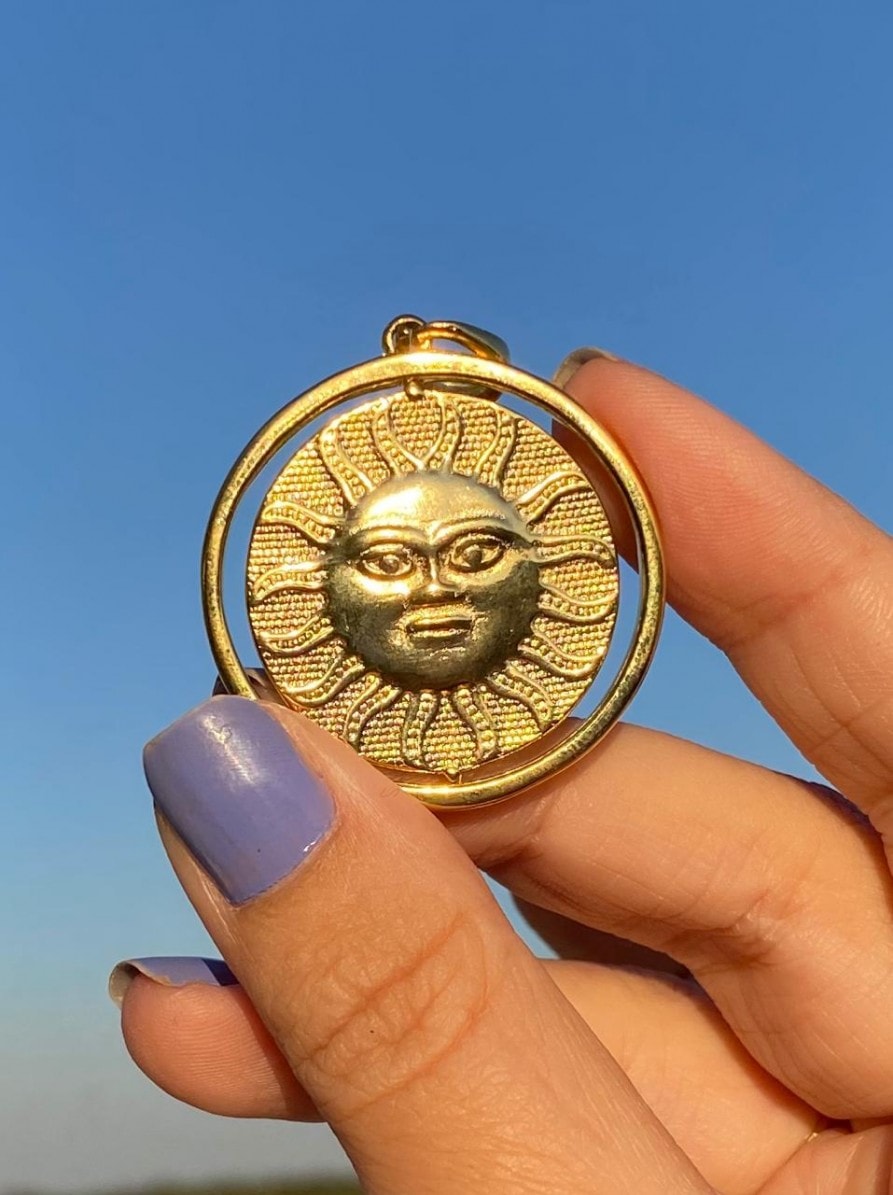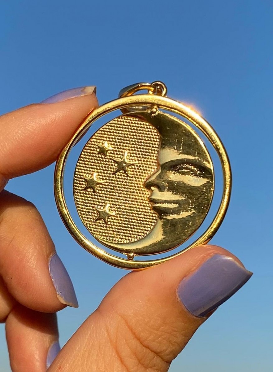 Pingente giratório. Gravação sol e lua. Banhado em ouro.