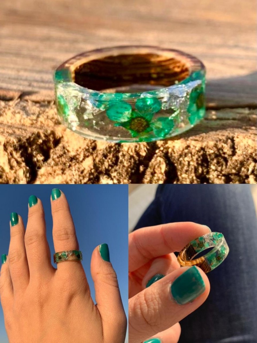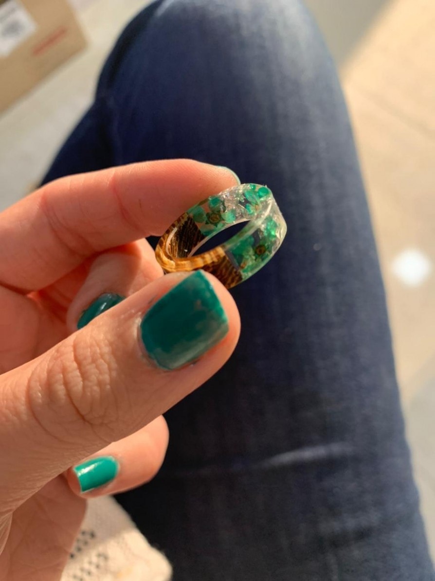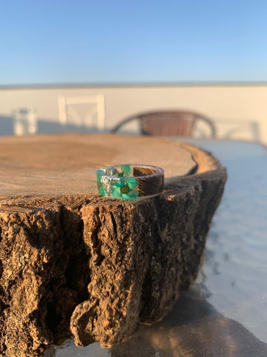 Anel artesanal Coco e Flores Azuis.