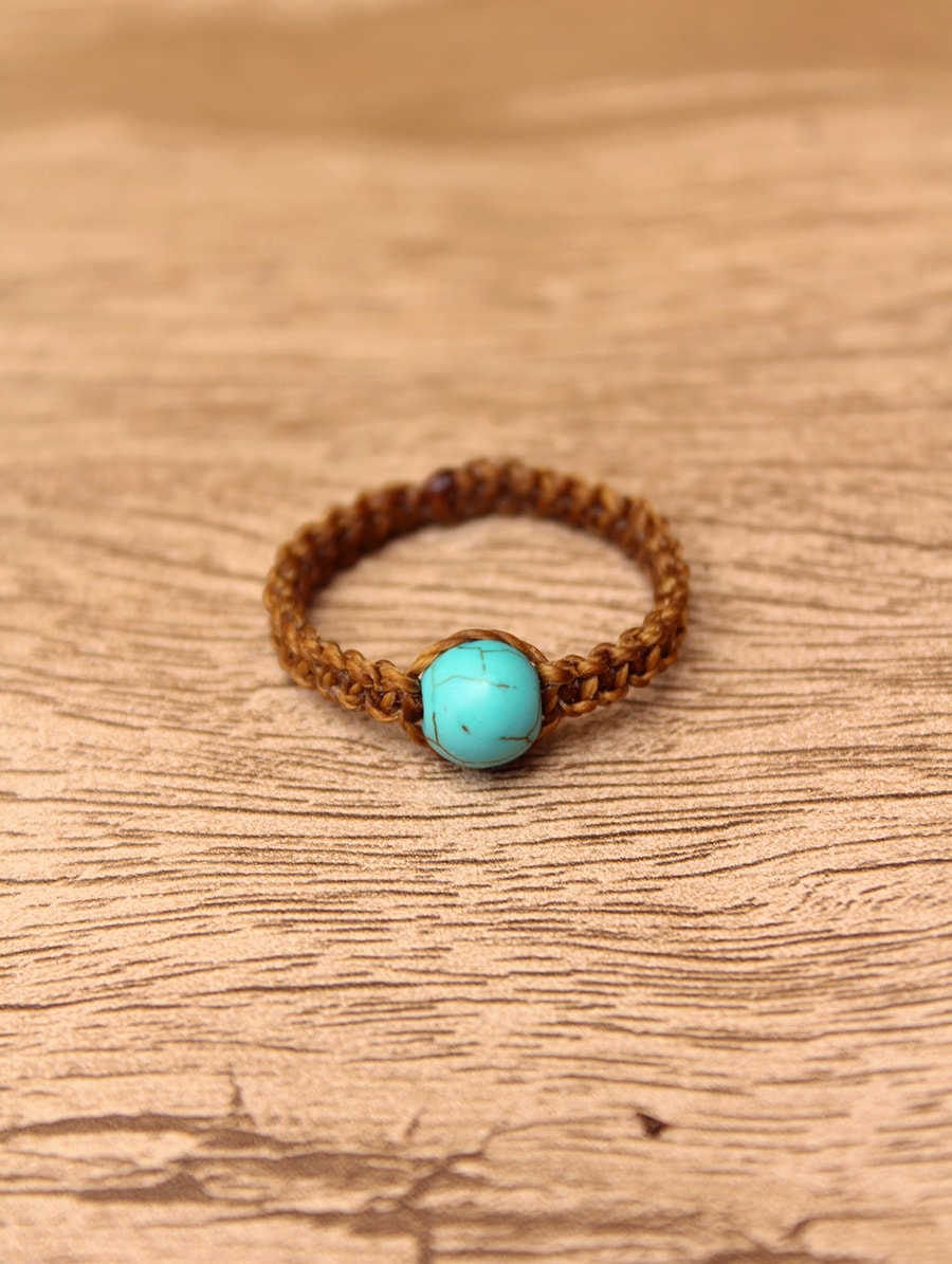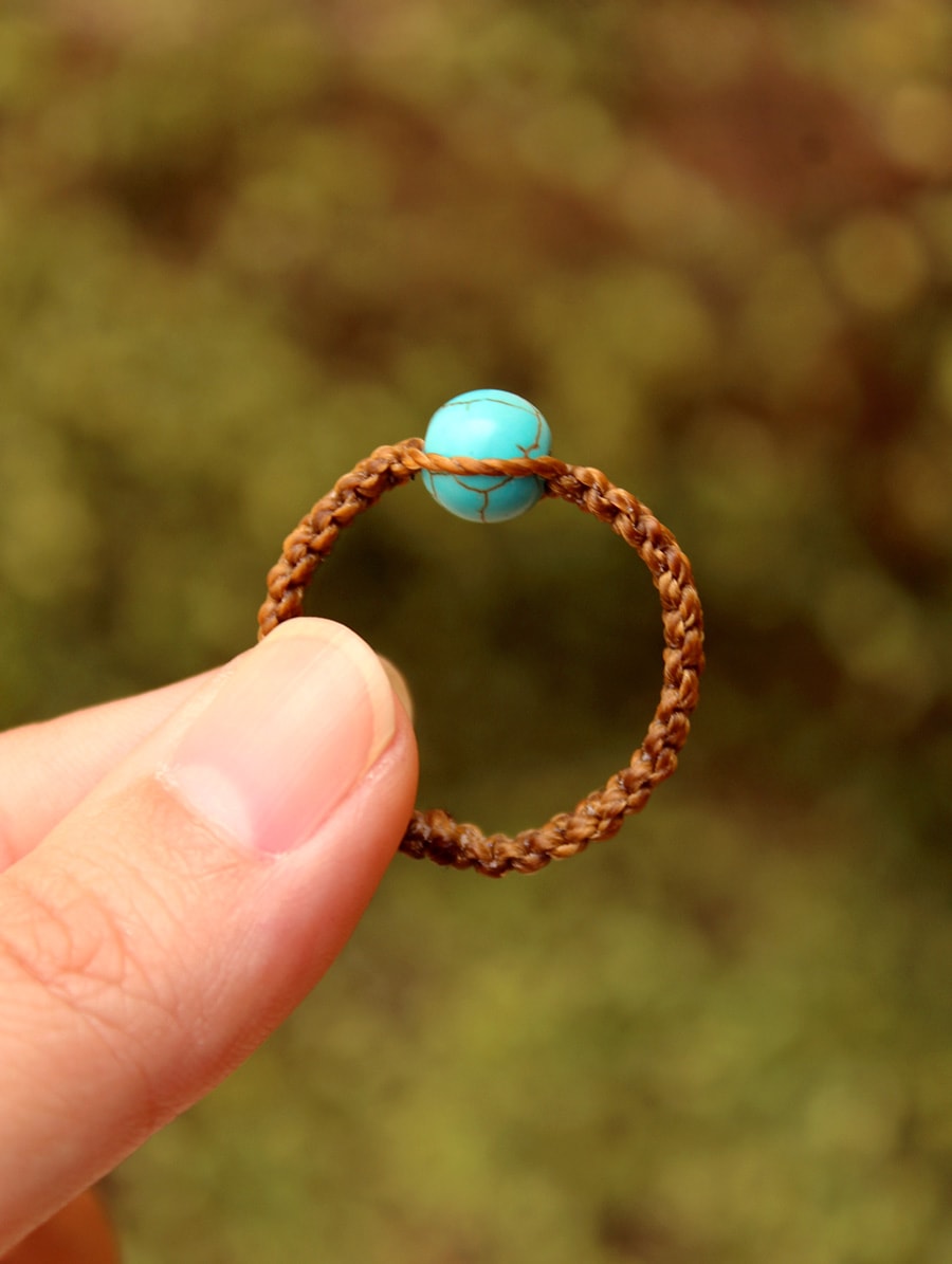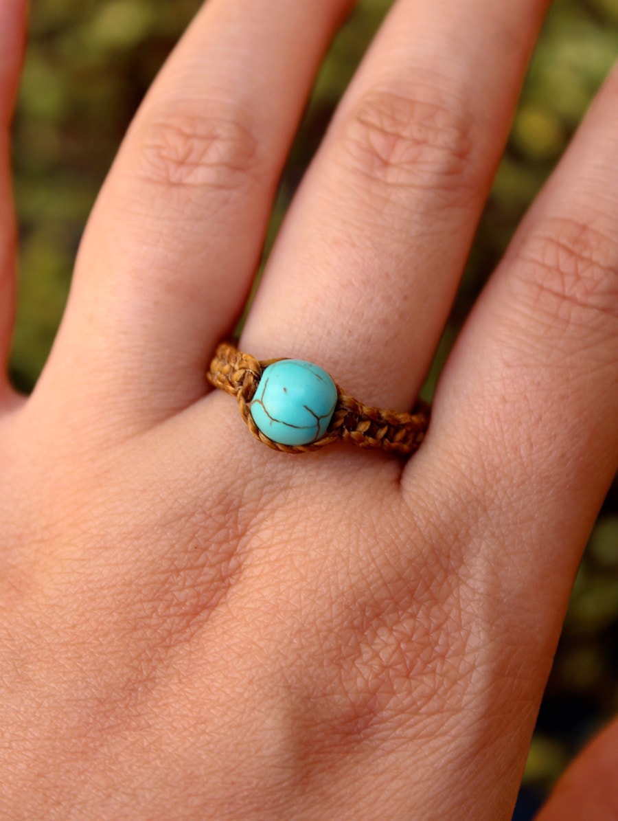 Anel artesanal com Turquesa. Cordão trançado à mão em técnica macramê.