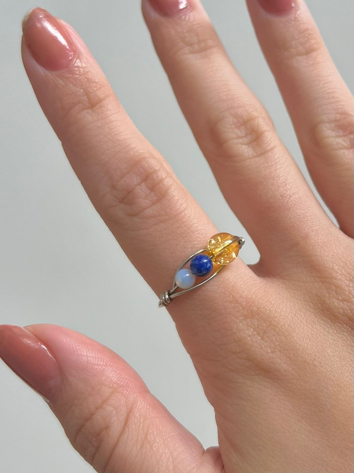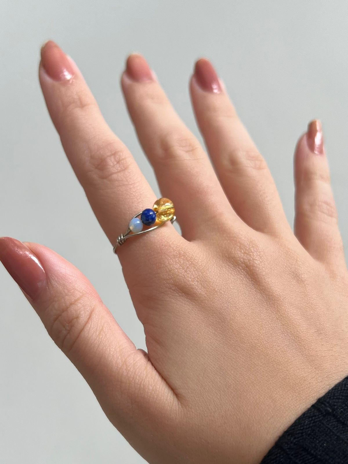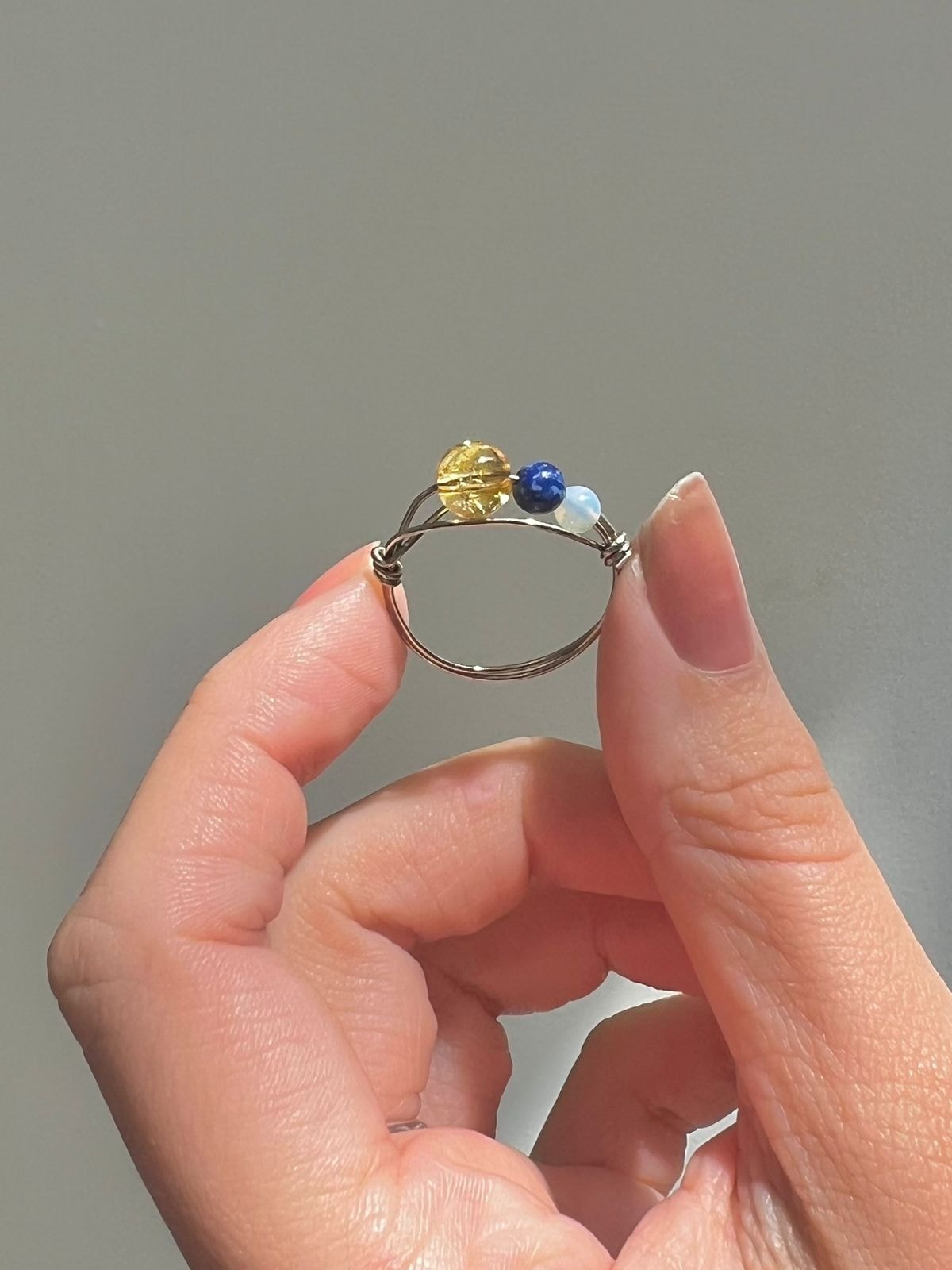 Anel artesanal representando o Sol, a Terra e a Lua.