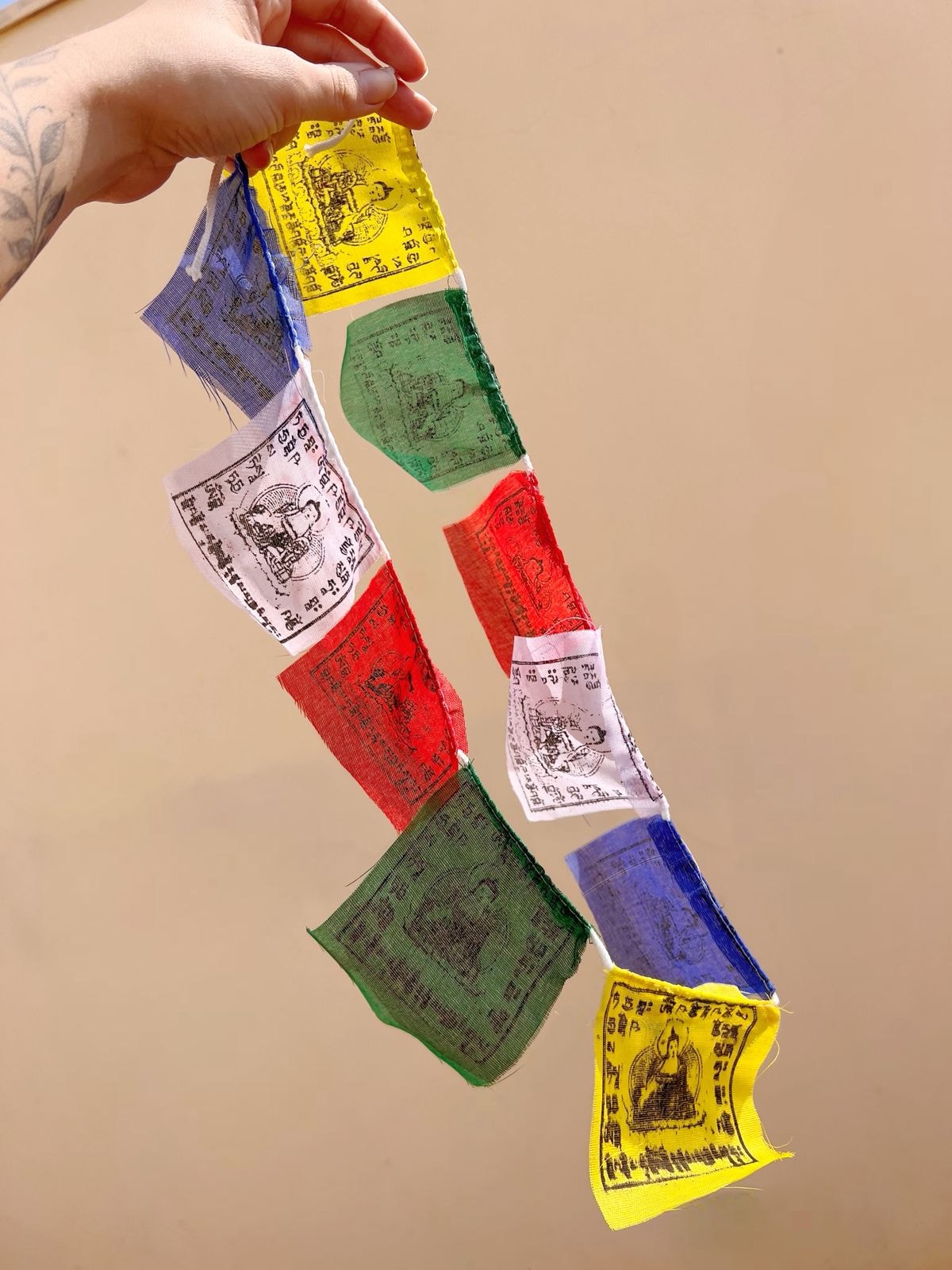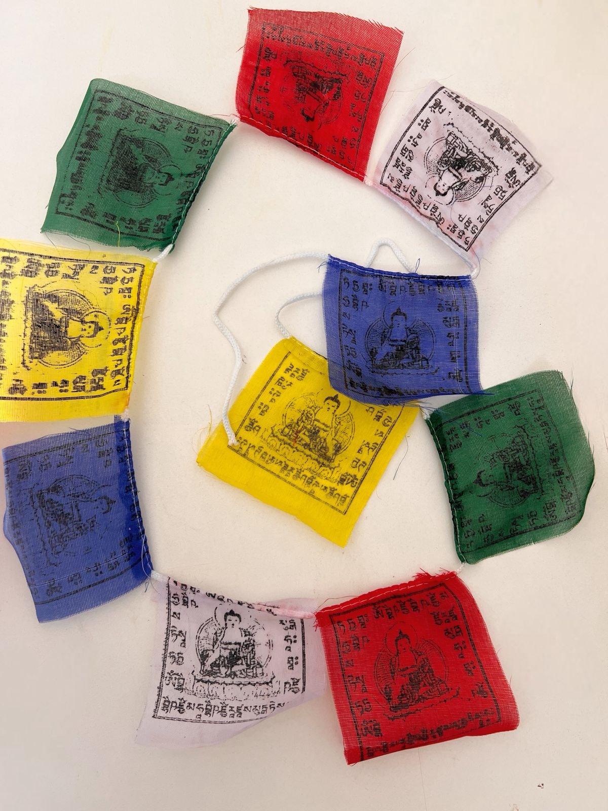 Bandeira tibetana com a imagem do cavalo de vento juntamente com o mantra budista, elas são organizadas em cinco cores que são usadas em uma corda com a intenção de trazer harmonia com equilíbrio dos cinco elementos da natureza, nos quais são: Céu, vento, fogo, água e terra.  As bandeiras na tradição tibetana são utilizadas para proteção, prosperidade, conhecimento, compaixão, purificação e paz.