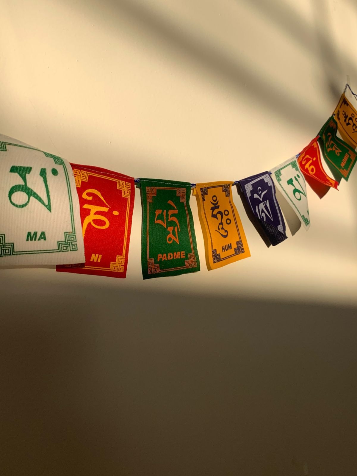 Bandeira tibetana com mantra om mani padme hum , elas são organizadas em cinco cores que são usadas em uma corda com a intenção de trazer harmonia com equilíbrio dos cinco elementos da natureza, nos quais são: Céu, vento, fogo, água e terra. As bandeiras na tradição tibetana são utilizadas para proteção, prosperidade, conhecimento, compaixão, purificação e paz. O vento que bate nas bandeiras leva as bênçãos das orações impressas no pano, de forma que o vento fica abençoado e os seres que respiram o seu ar recebem as bênçãos.