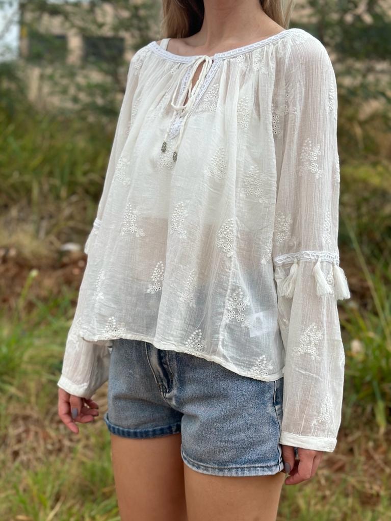 Feito em viscose na cor branca, este modelo de mangas longas conta com punhos marcados, um discreto decote canoa, com detalhes boho na manga.