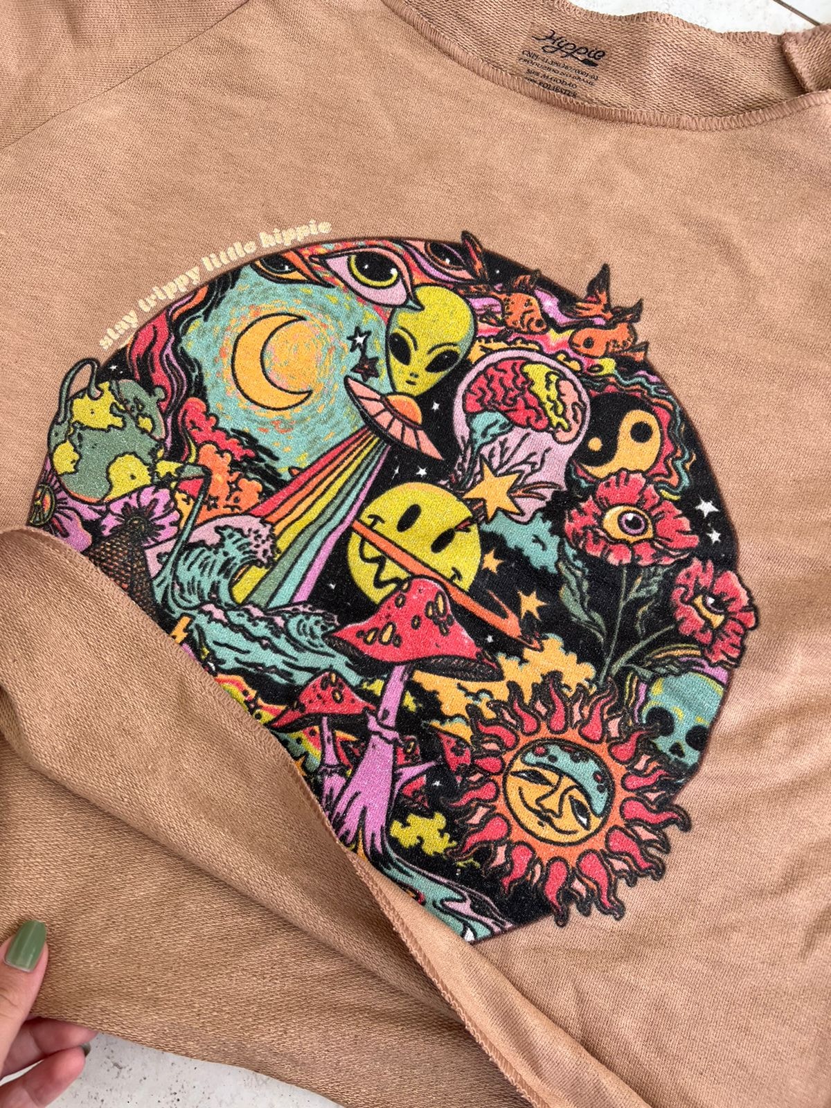 A blusa moletom Trip Hippie é como uma viagem pelo inconsciente. Com elementos diversos e cheios de significados, a estampa Trip Hippie é psicodélica, colorida e alegre.