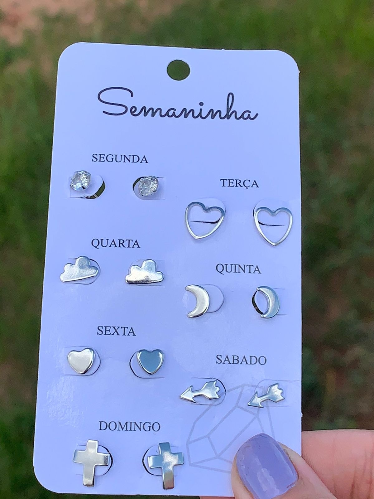 Conjunto de 7 pares de brinco, um para cada dia da semana.