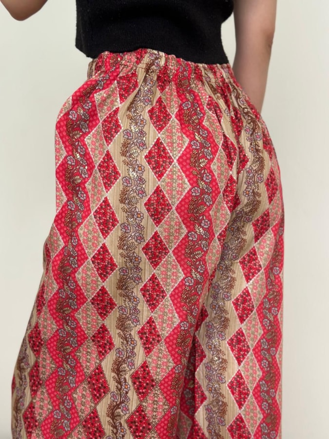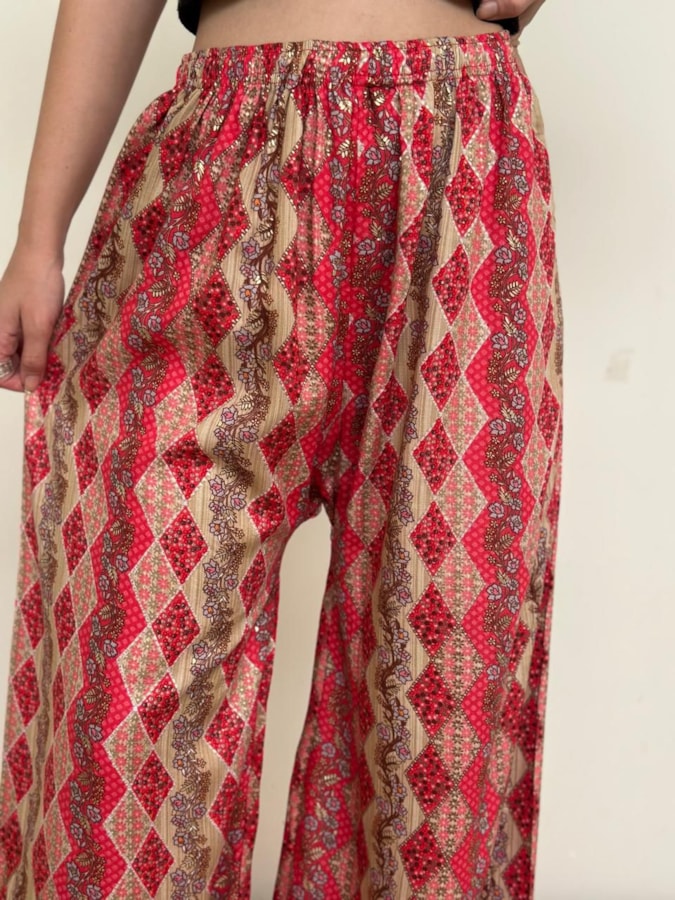 A calça indiana é estampada com imagens presentes na cultura da Índia, que remetem à forte espiritualidade do povo indiano.