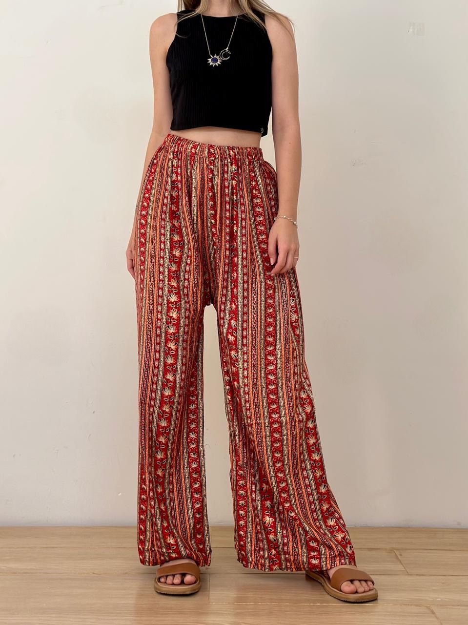 A calça indiana da Hippie é estilo pantalona.