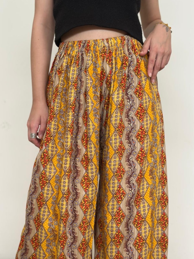 A calça indiana é estampada com imagens presentes na cultura da Índia, que remetem à forte espiritualidade do povo indiano.