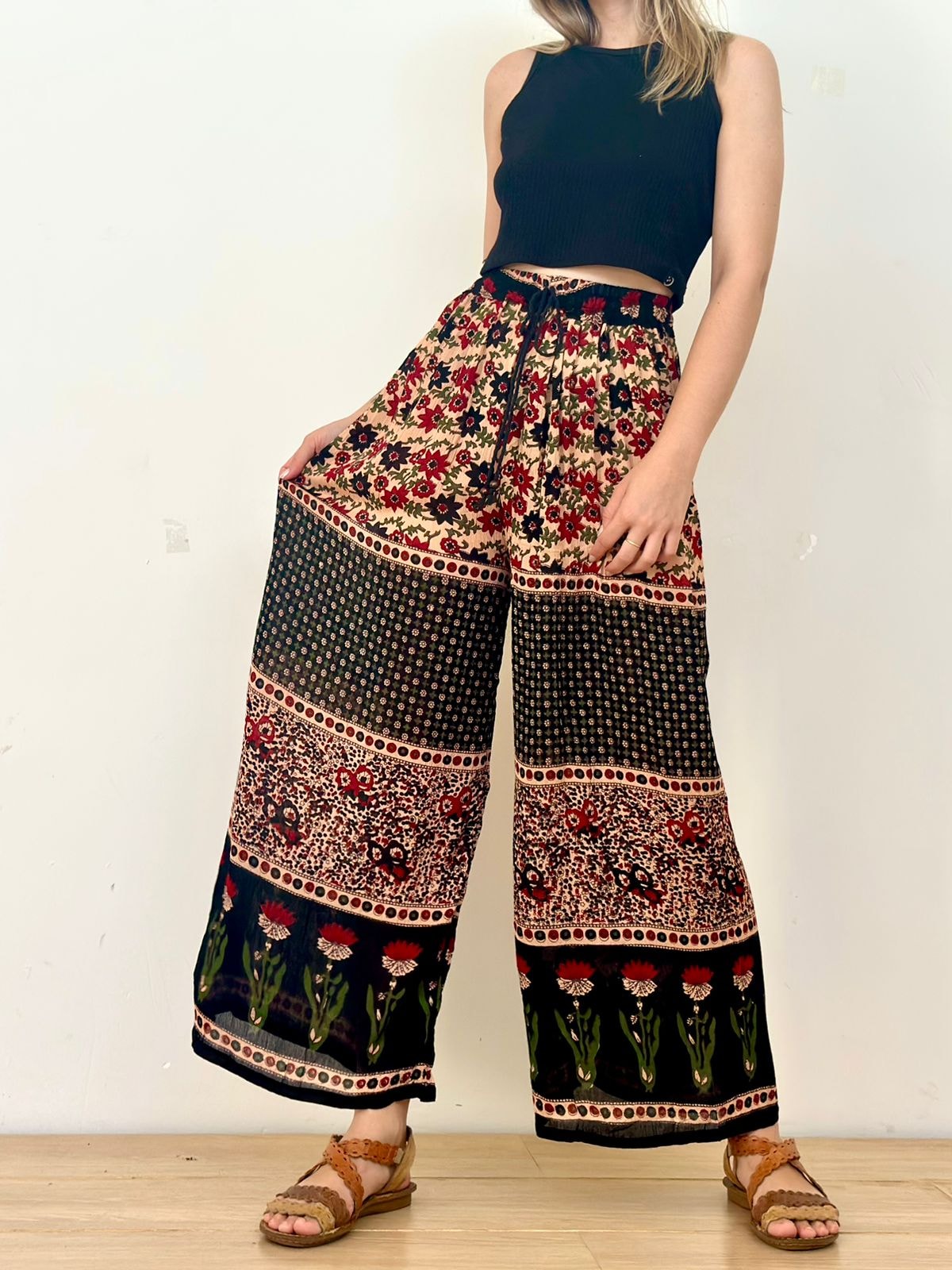 A calça indiana é estampada com imagens presentes na cultura da Índia, que remetem à forte espiritualidade do povo indiano.