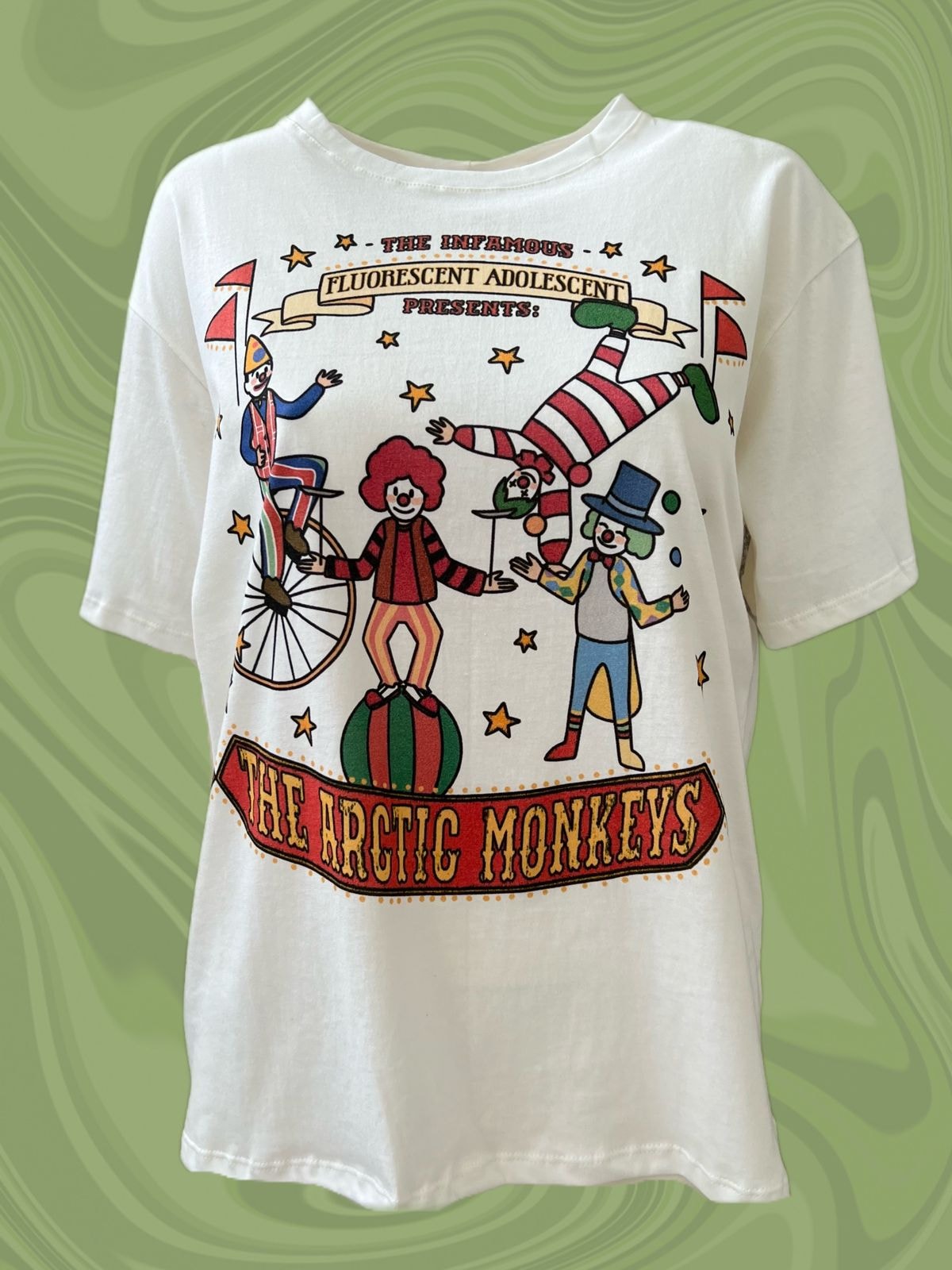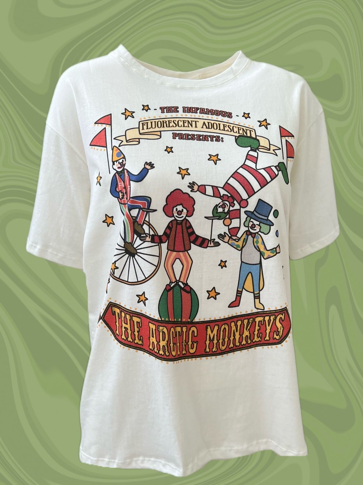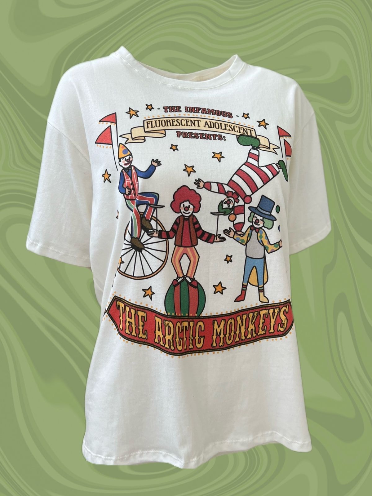A camiseta Arctic Monkeys Fluorescent Adolescent é uma representação do clipe da música, que envolve uma briga entre um grupo de palhaços e um grupo de ‘não-palhaços’.