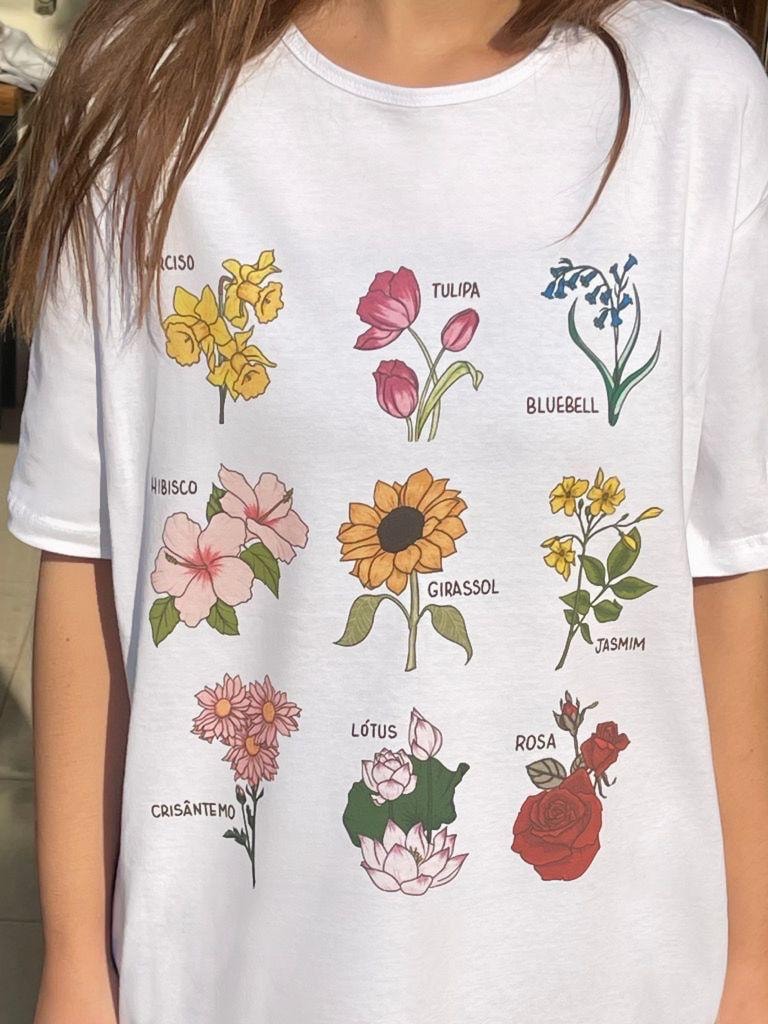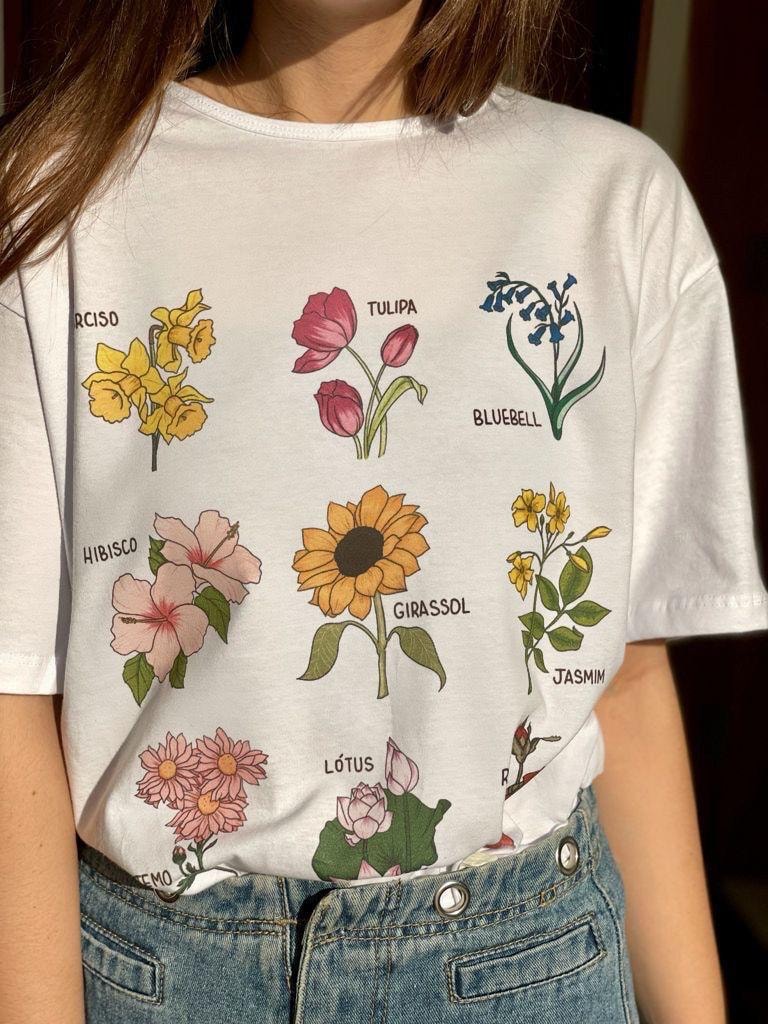 A camiseta Botânica traz em sua estampa flores com significados profundos. Usar esta camiseta é uma forma de atrair as propriedades das plantas ao seu dia a dia.