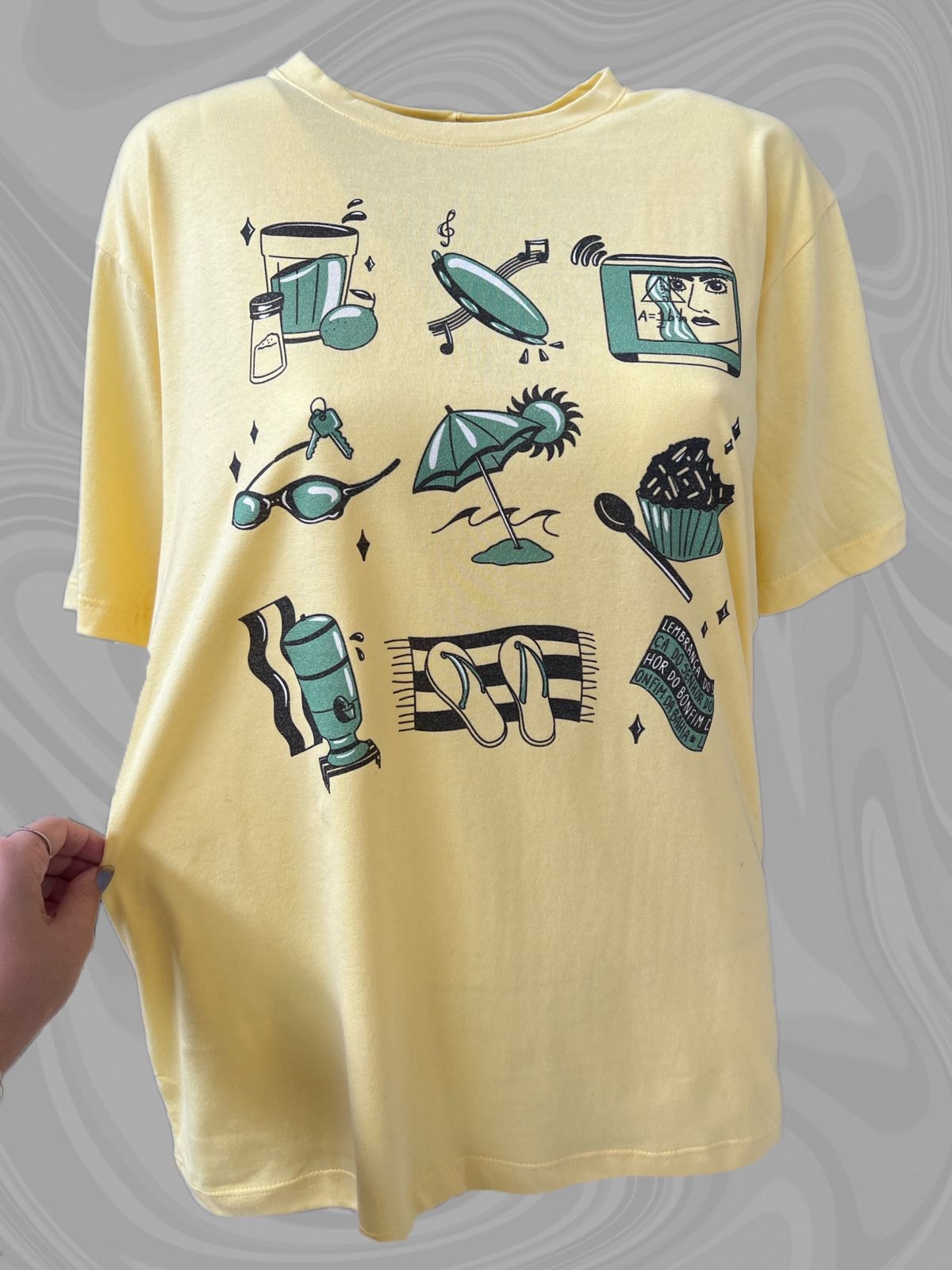 A estampa Brasilidades tem o kit de sobrevivência do brasileiro. Chinelo no pé, sal e limão para temperar a cerveja, pé na areia, pandeiro na mão, brigadeiro na colher, uma novela no final do dia e muita água direto do filtro de barro.