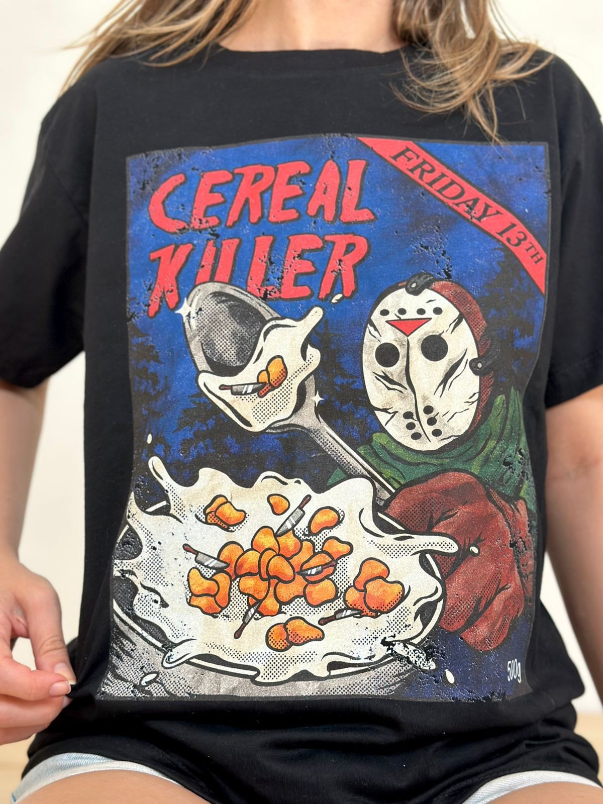 O Cereal Killer dessa camiseta representa as pessoas que não sabem dividir comida.