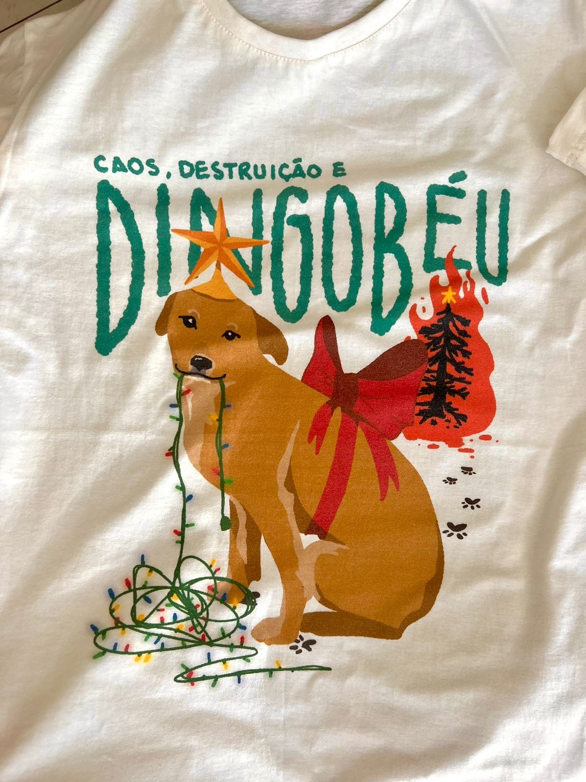 A camiseta Dingobéu Cachorro representa o vira-lata caramelo de um jeito que a gente reclama, mas no fundo ama: causando caos e destruição.