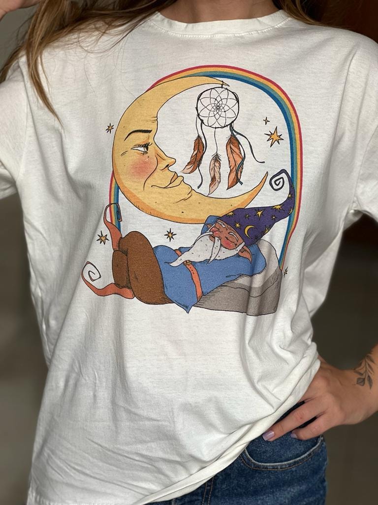 Um duende tranquilo em seu descanso, protegido das más energias pelo filtro dos sonhos e pela luz da lua.