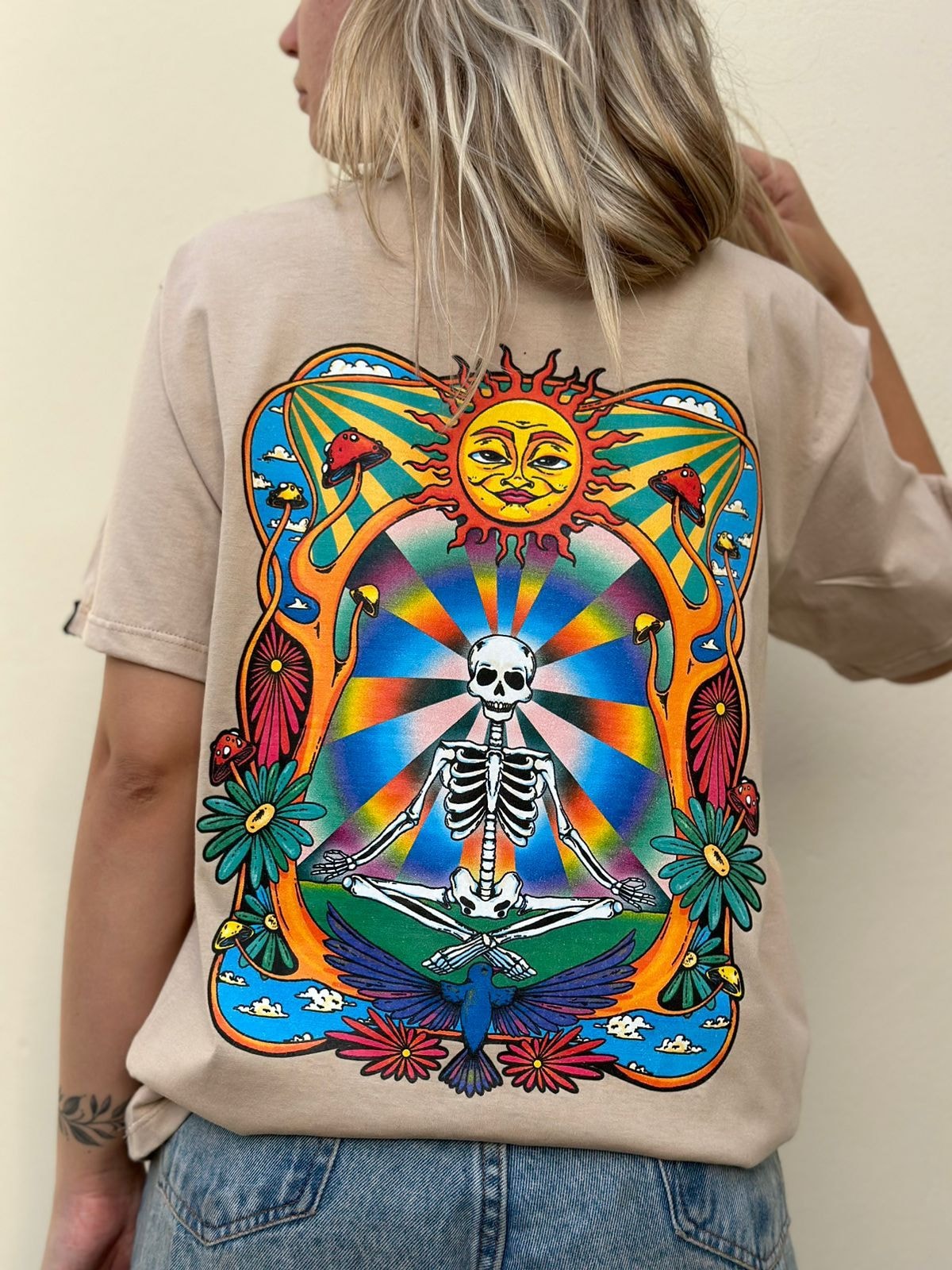 Na estampa, o esqueleto psicodélico medita enquanto se conecta com a natureza e suas forças através da psicodelia.