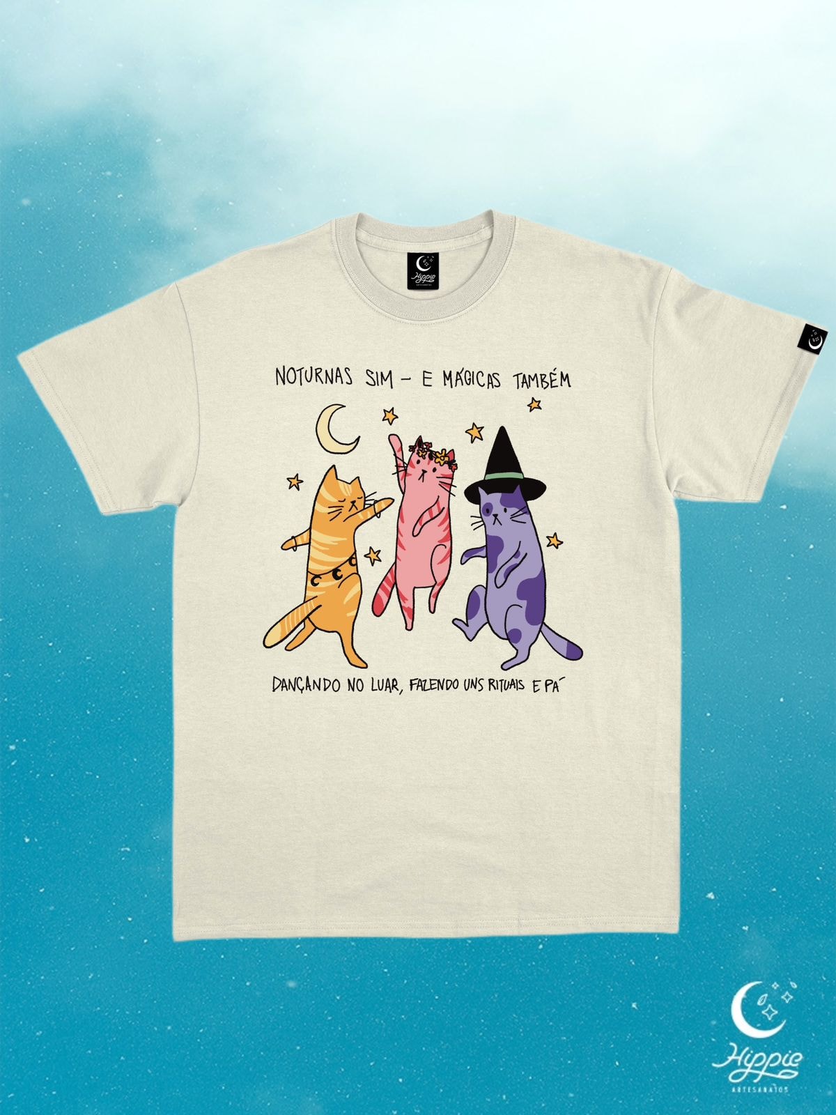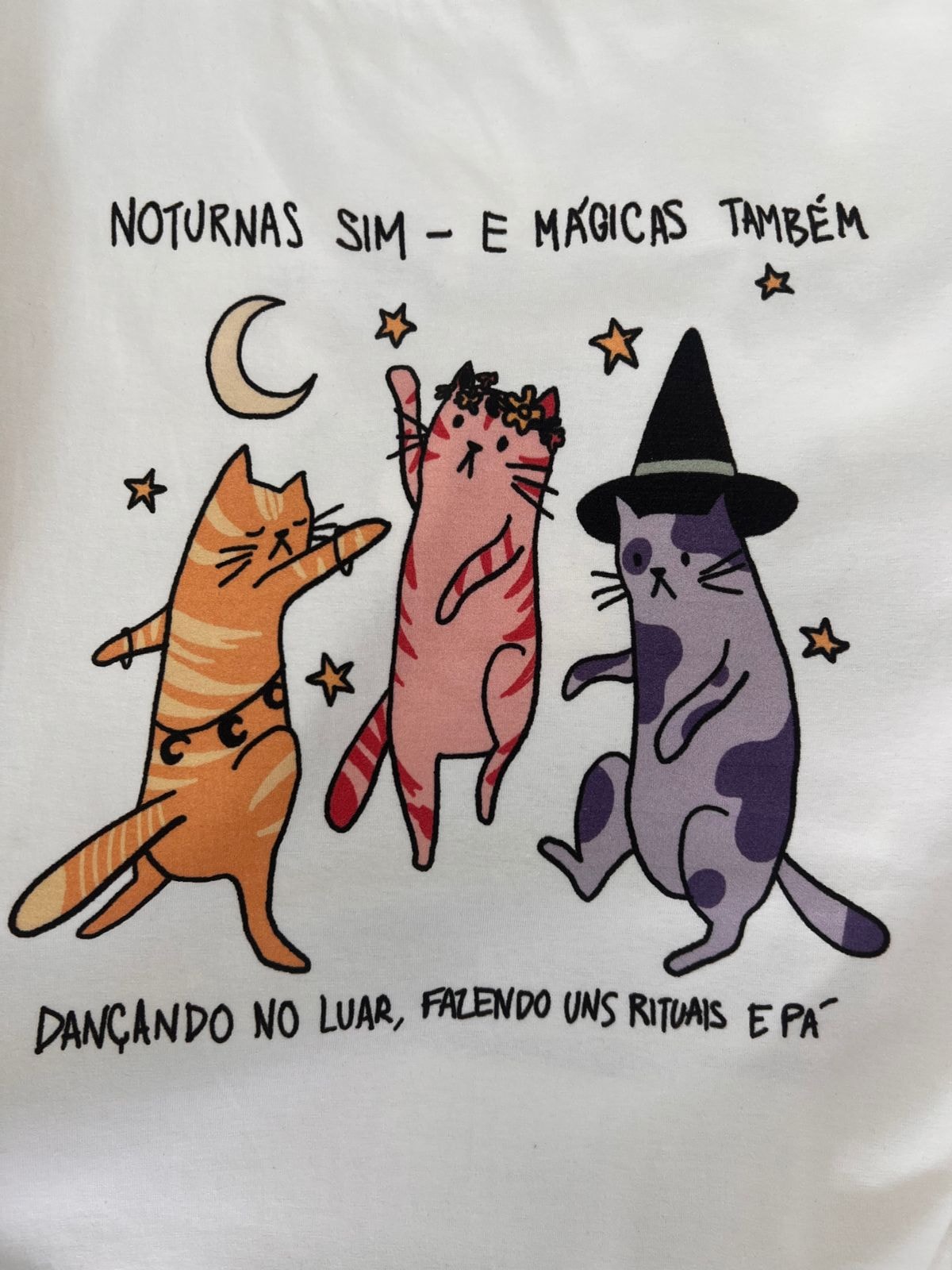 A camiseta Gatas Noturnas é para as místicas e mães de pet, que adoram fazer rituais durante a noite na companhia de seus gatos.
