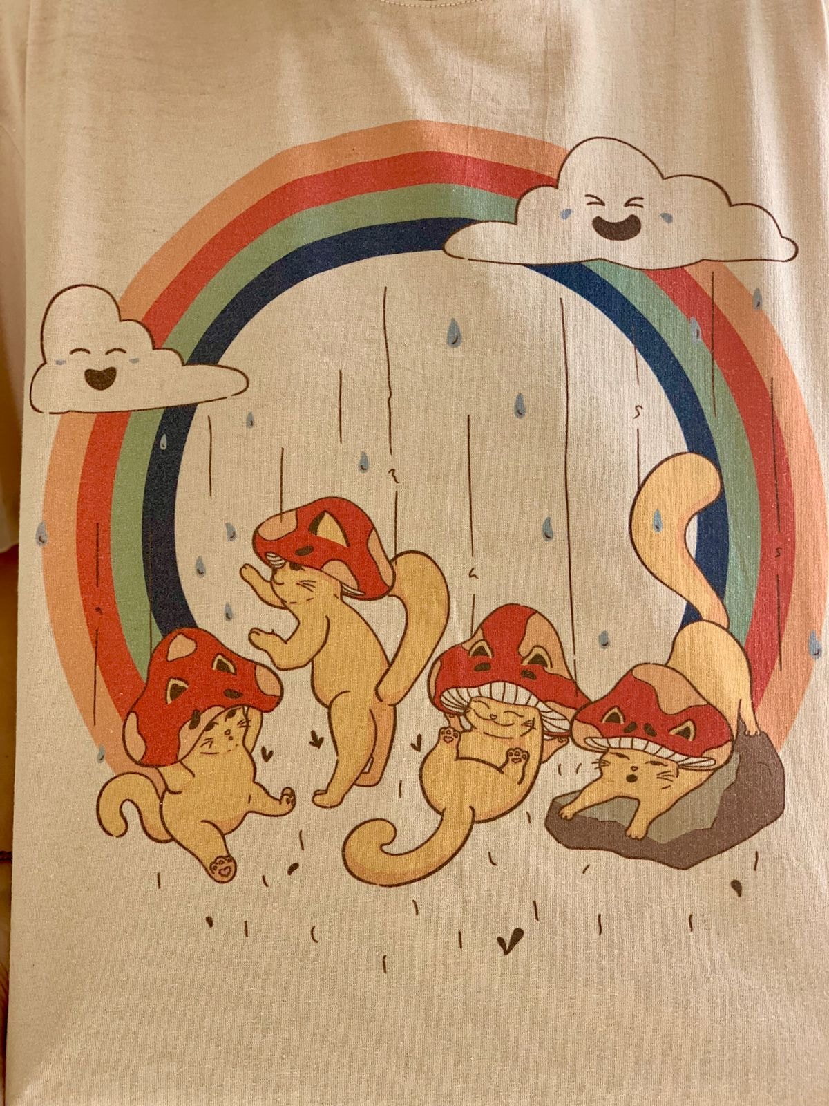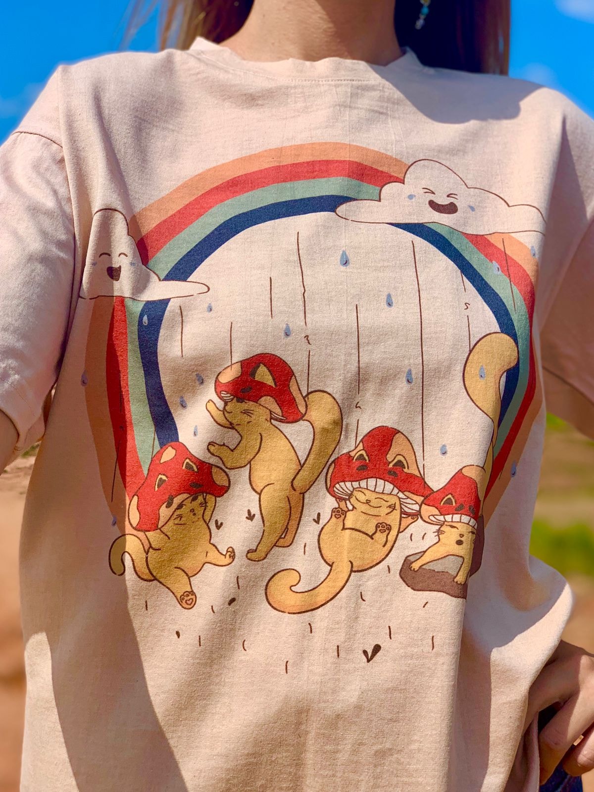 Gatos são animais místicos, e cogumelos são elementos mágicos da natureza. Juntos, fazem parte do mundo encantado que nós humanos não conseguimos ver.