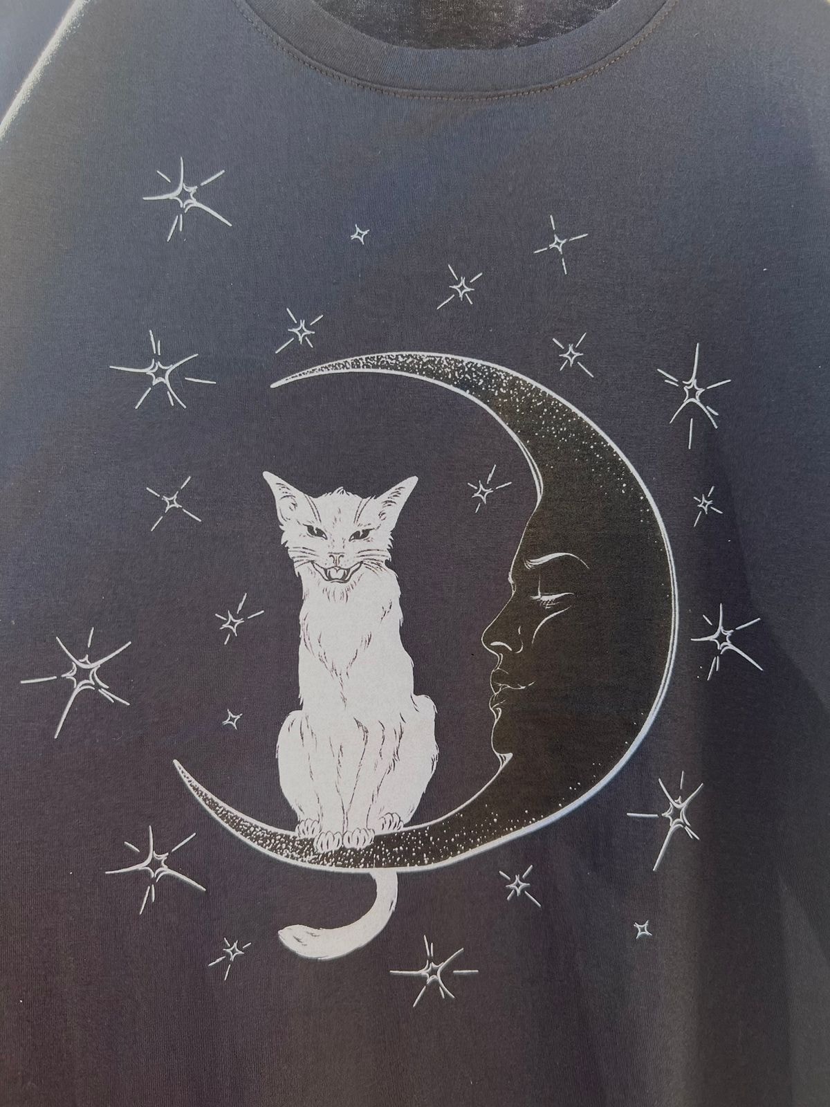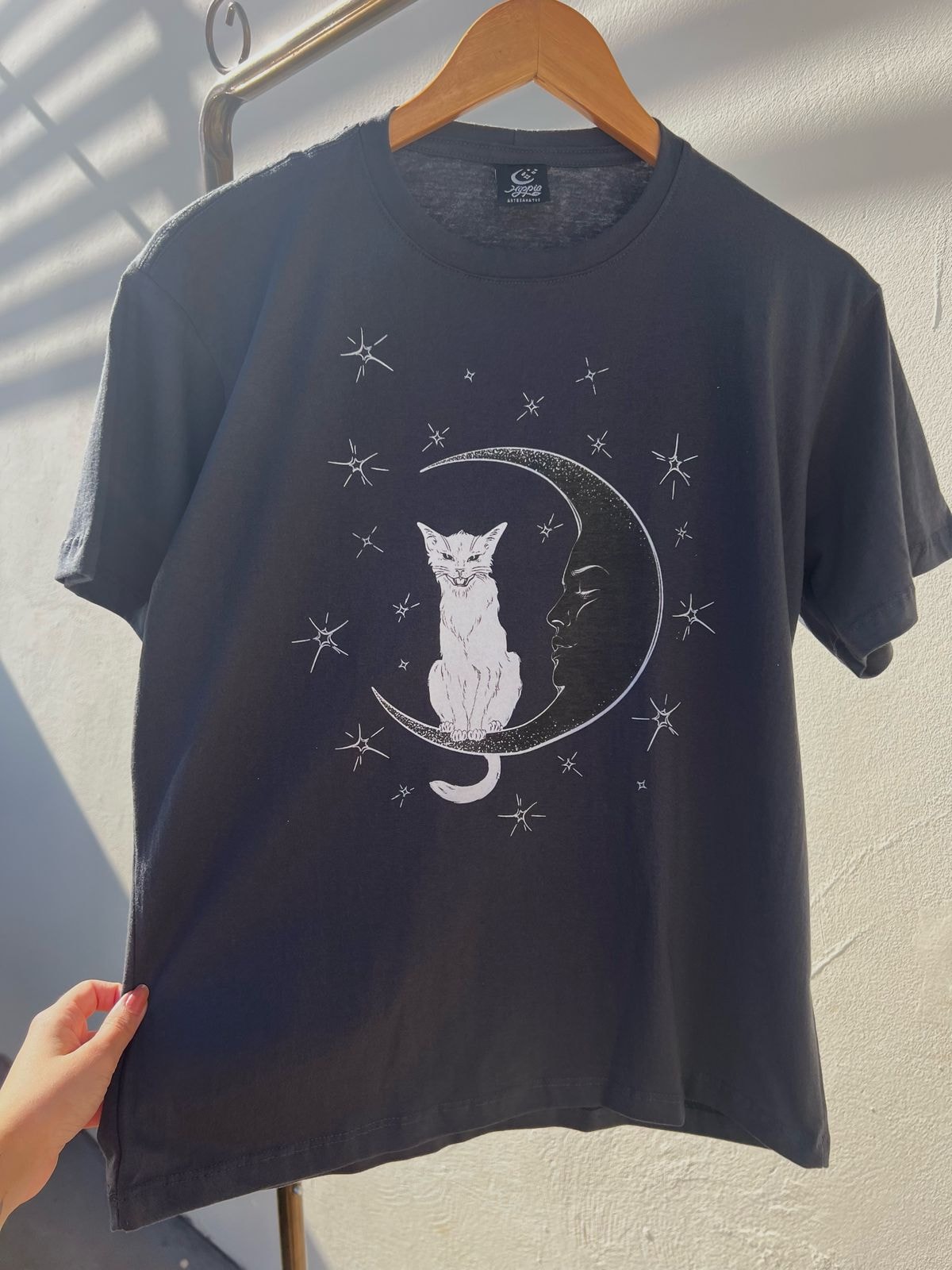 A camiseta Gato na Lua tem um tom místico como os felinos e a lua, astro que representa intuição, introspecção, emoção e feminilidade.