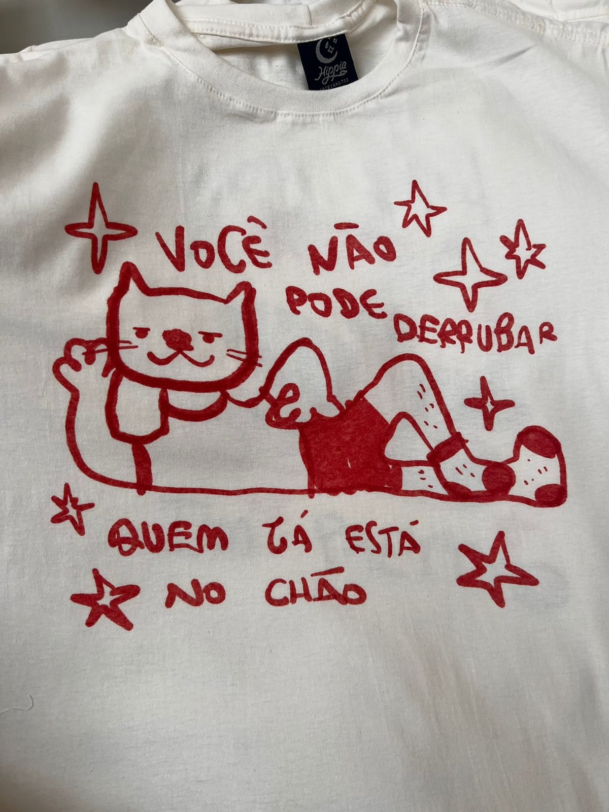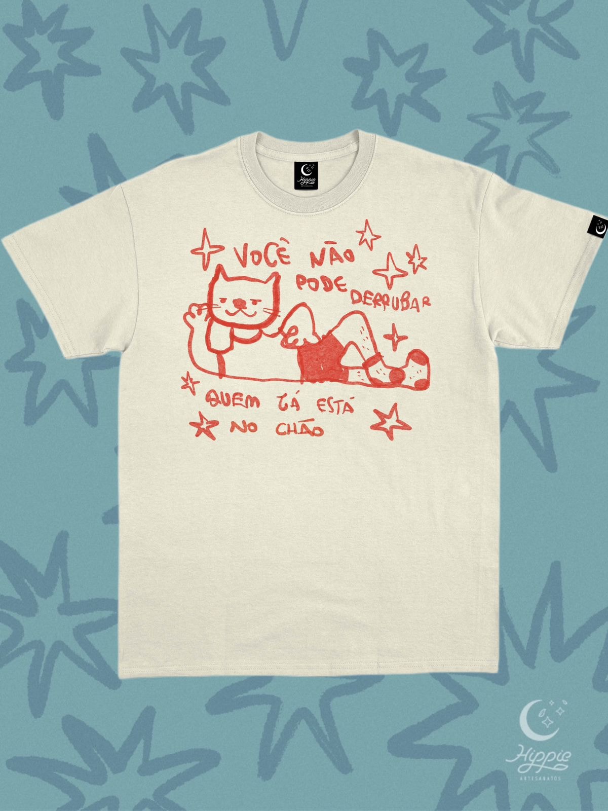 A camiseta Gatos da Motivação já chega dando o recado: Você não pode derrubar quem já está no chão.
