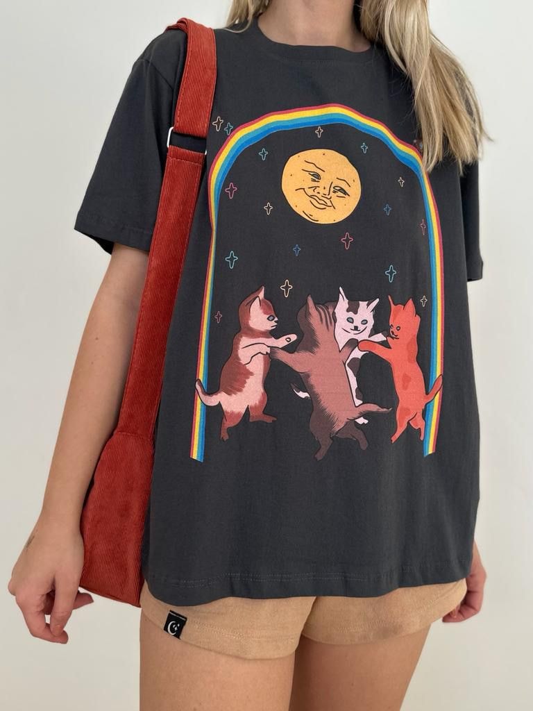 Na camiseta Gatos Fest, uma turma de gatinhos está ritualizando em dia de lua cheia, em meio aos elementos naturais e em harmonia com outras formas de vida.