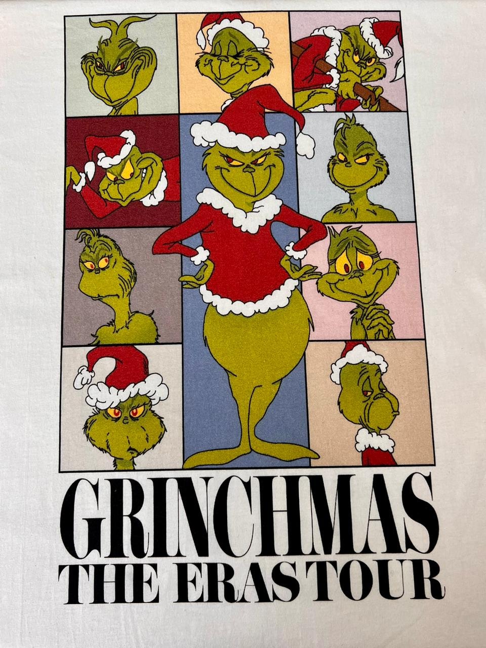 A camiseta Grinchmas The Eras Tour representa nosso personagem natalino preferido em suas diversas eras, da mais tranquila à mais travessa.
