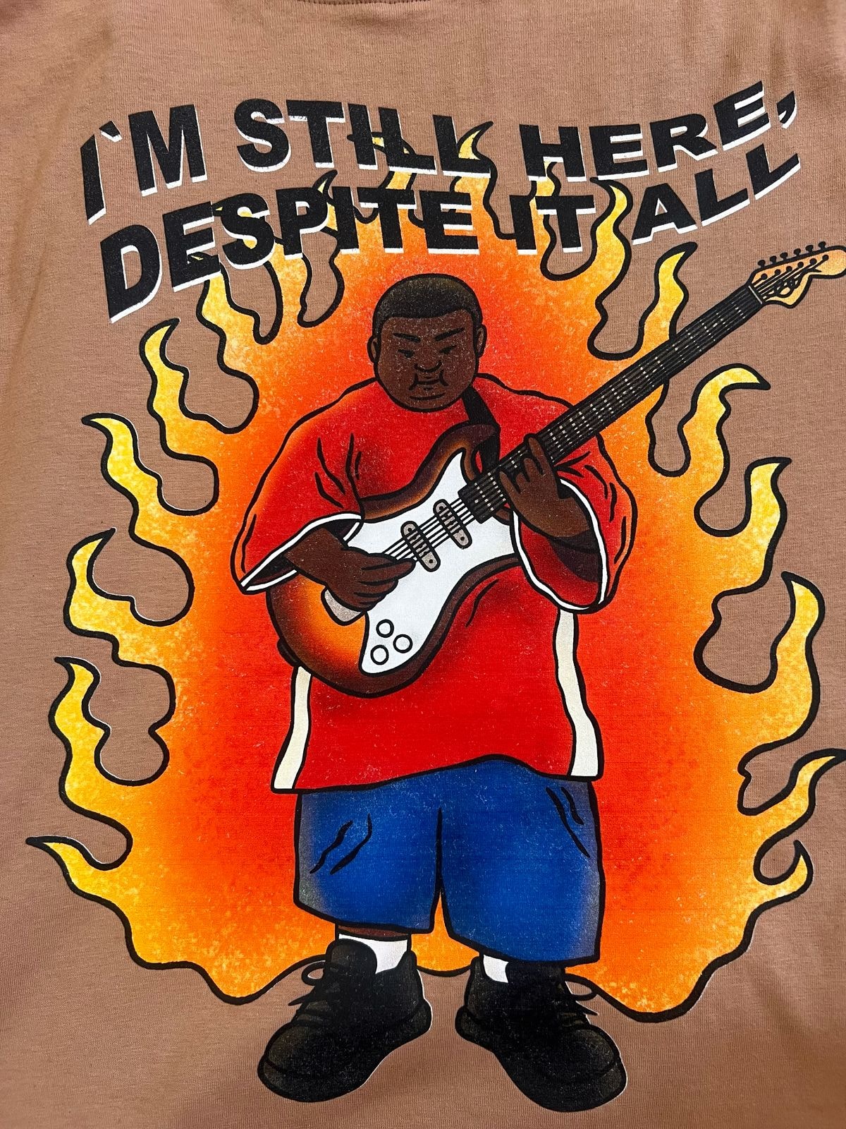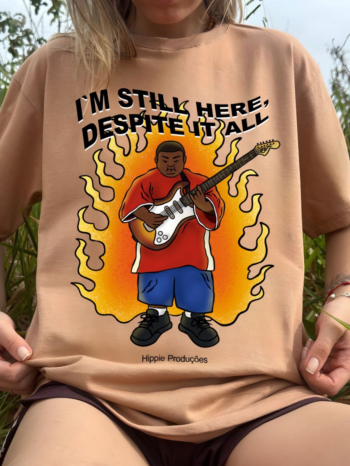 Essa camiseta traz uma estampa poderosa que transmite a ideia de que, apesar de tudo, a guitarra continua a tocar e a alma continua a cantar. Perfeita para quem encontra força na música e acredita que, não importa o que aconteça, a melodia sempre prevalecerá.