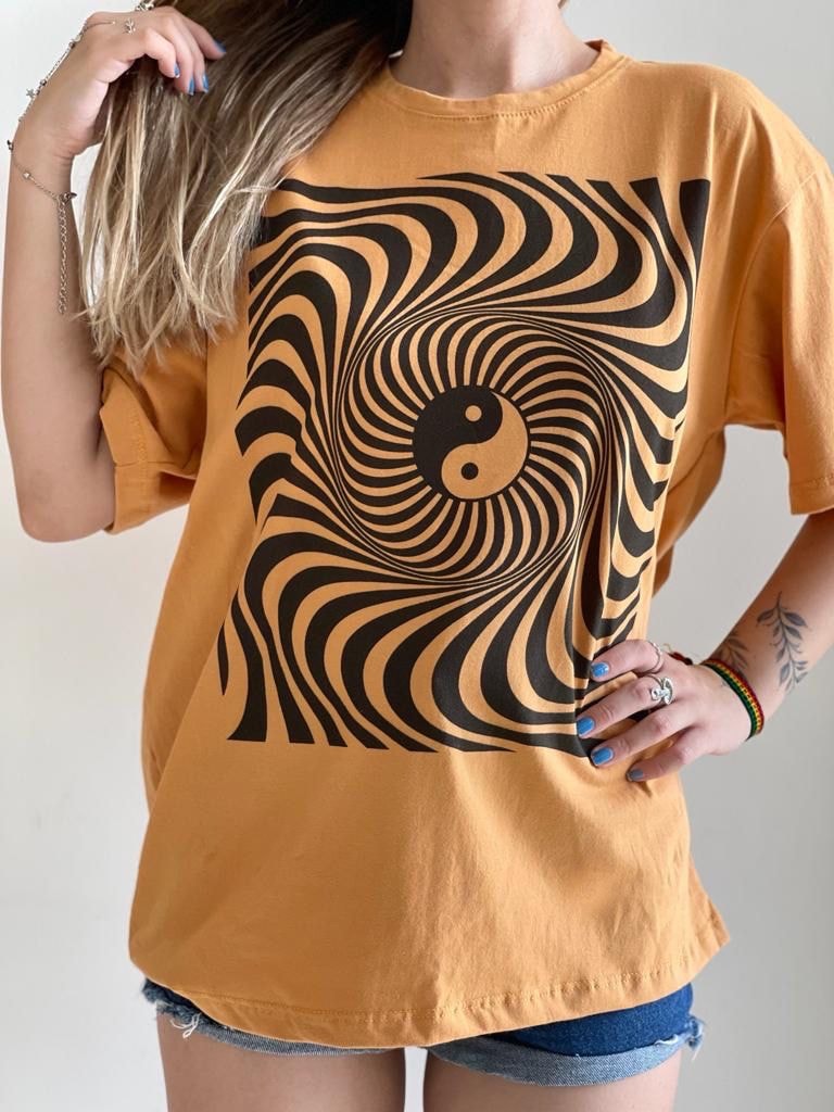 A camiseta Ilusão Yin Yang representa a ideia de que o Yin Yang é o príncipio de todas as coisas.