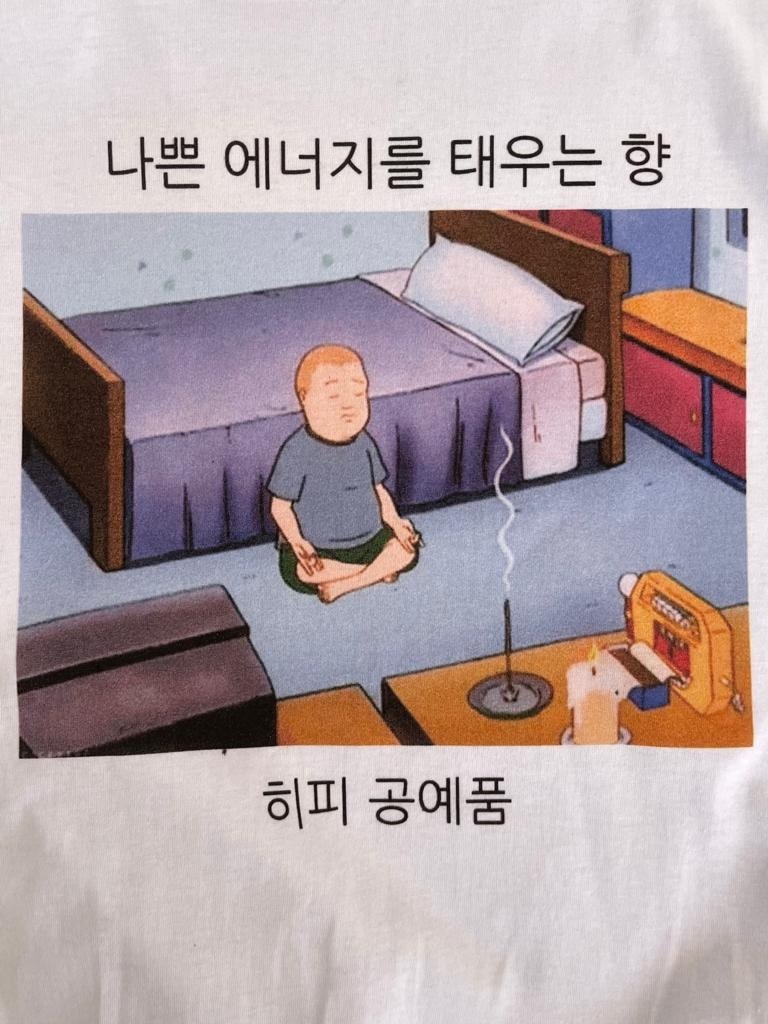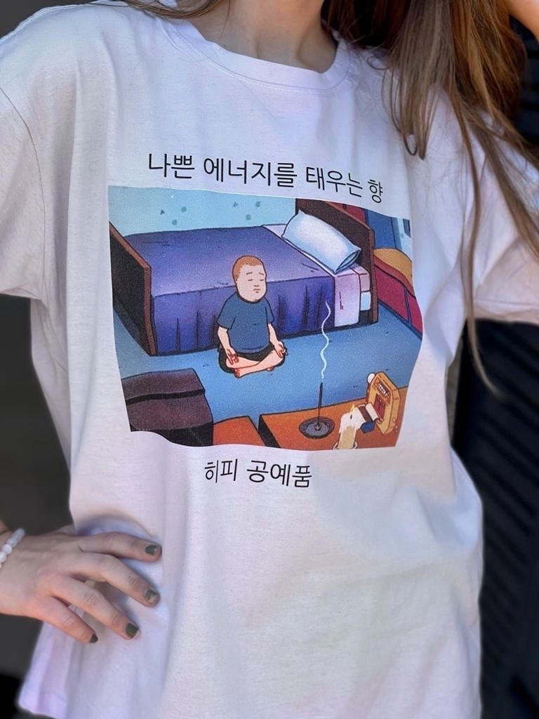 Na estampa, uma frase em coreano com o significado: Incenso que queima energia negativa.