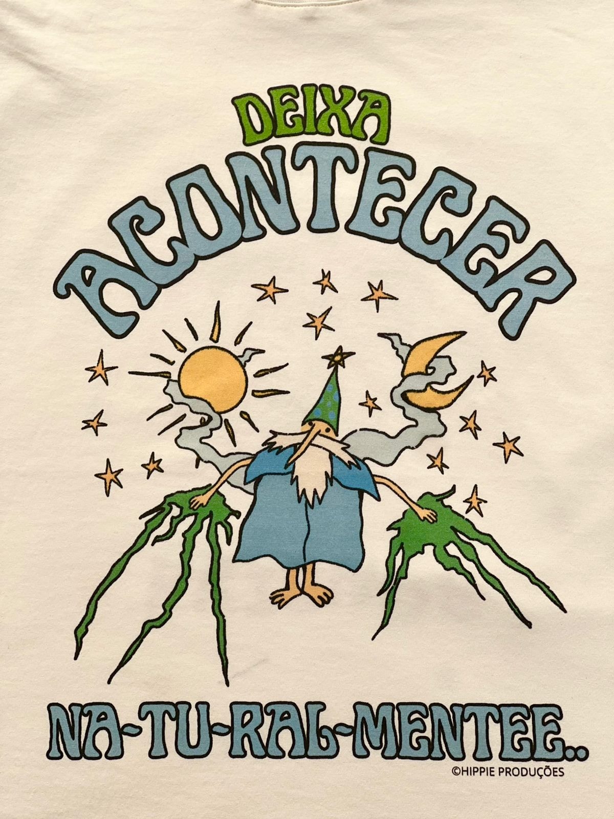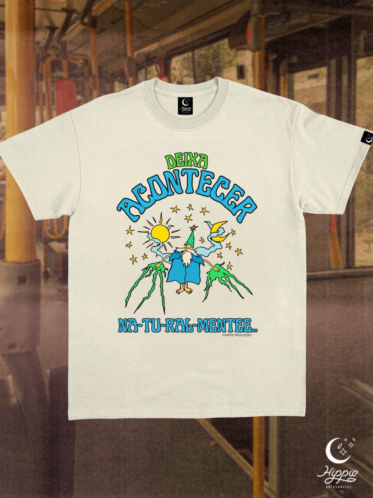Pra quem não força nada, só solta um "deixa acontecer naturalmente" e joga o tarô depois. Essa camiseta é pra você que vive no modo zen debochado, acredita nas forças do universo (ou no poder do Wi-Fi), e entende que às vezes é melhor deixar o caos astral agir.