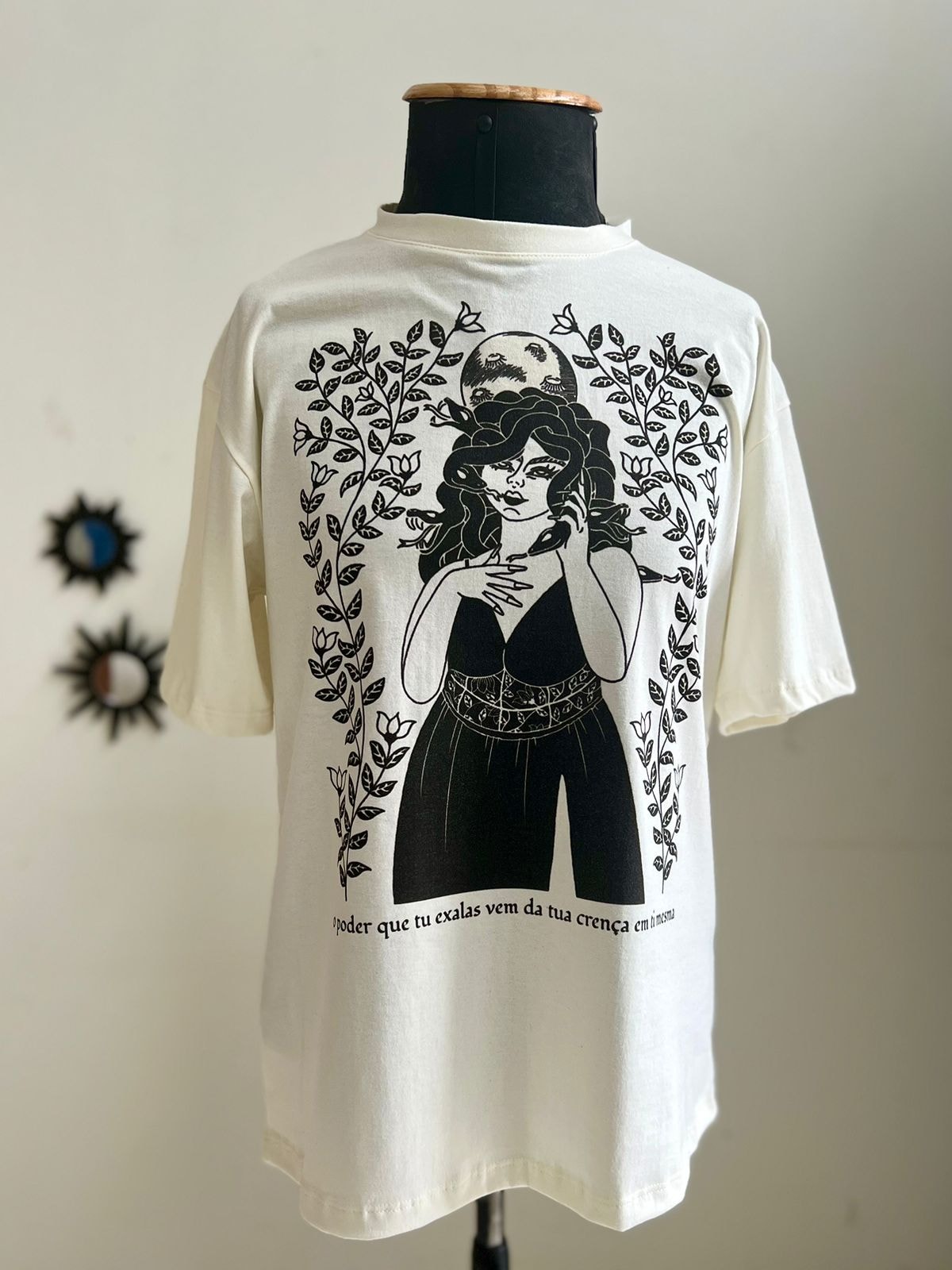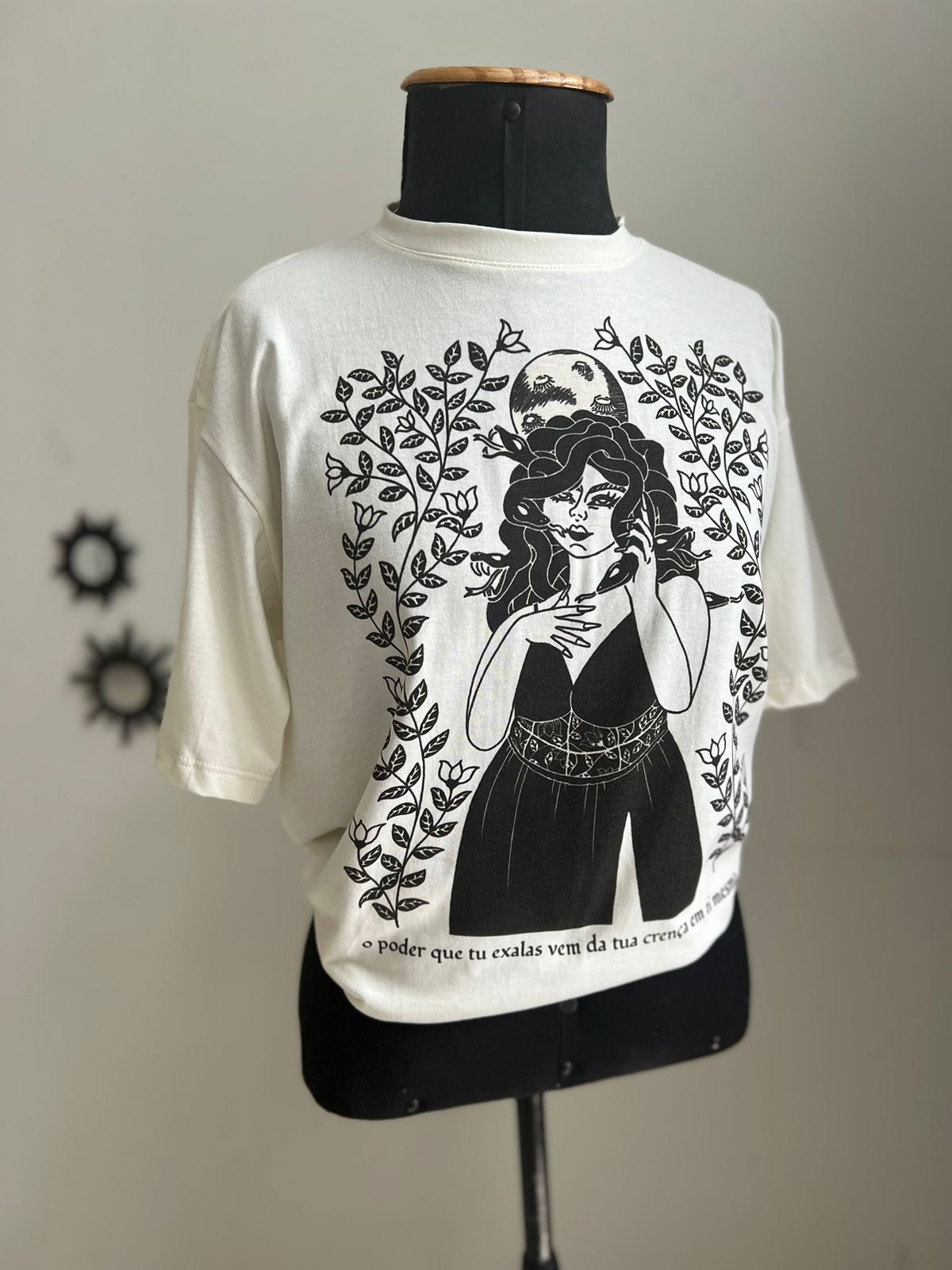 Nessa camiseta, Medusa é retrata a partir da técnica de xilogravura, uma das formas de arte mais populares da região Nordeste.
