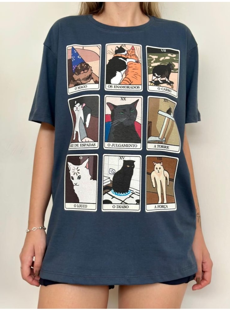 A camiseta Memes de Gato traz momentos icônicos destes animais excêntricos, agora em formato de tarot, para representar o lado mágico e enigmático dos felinos.