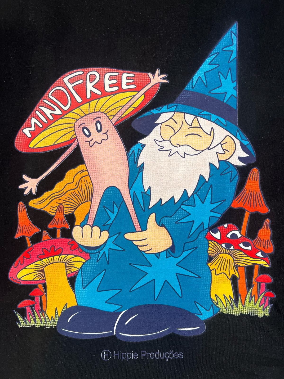 Com um mago místico no rolê e cogumelos psicodélicos espalhados pela estampa, essa camiseta é pra quem curte estilo com um toque de magia e liberdade.