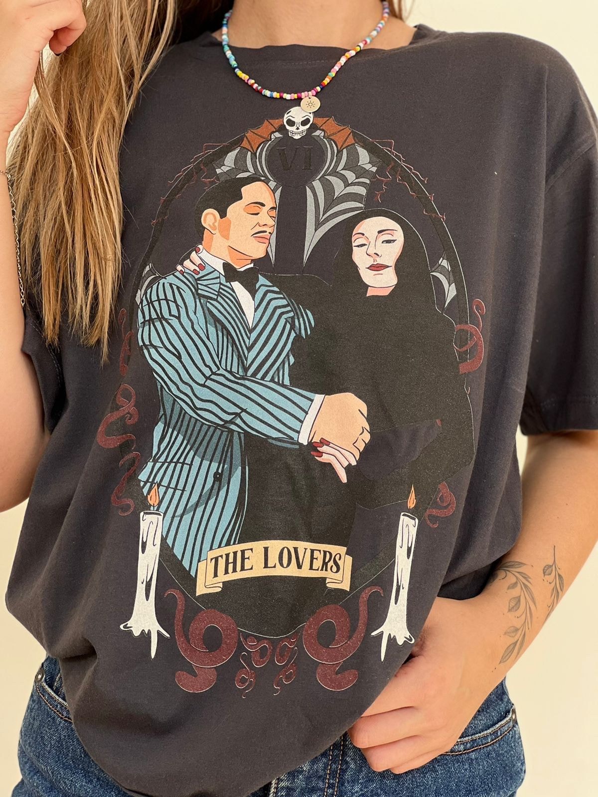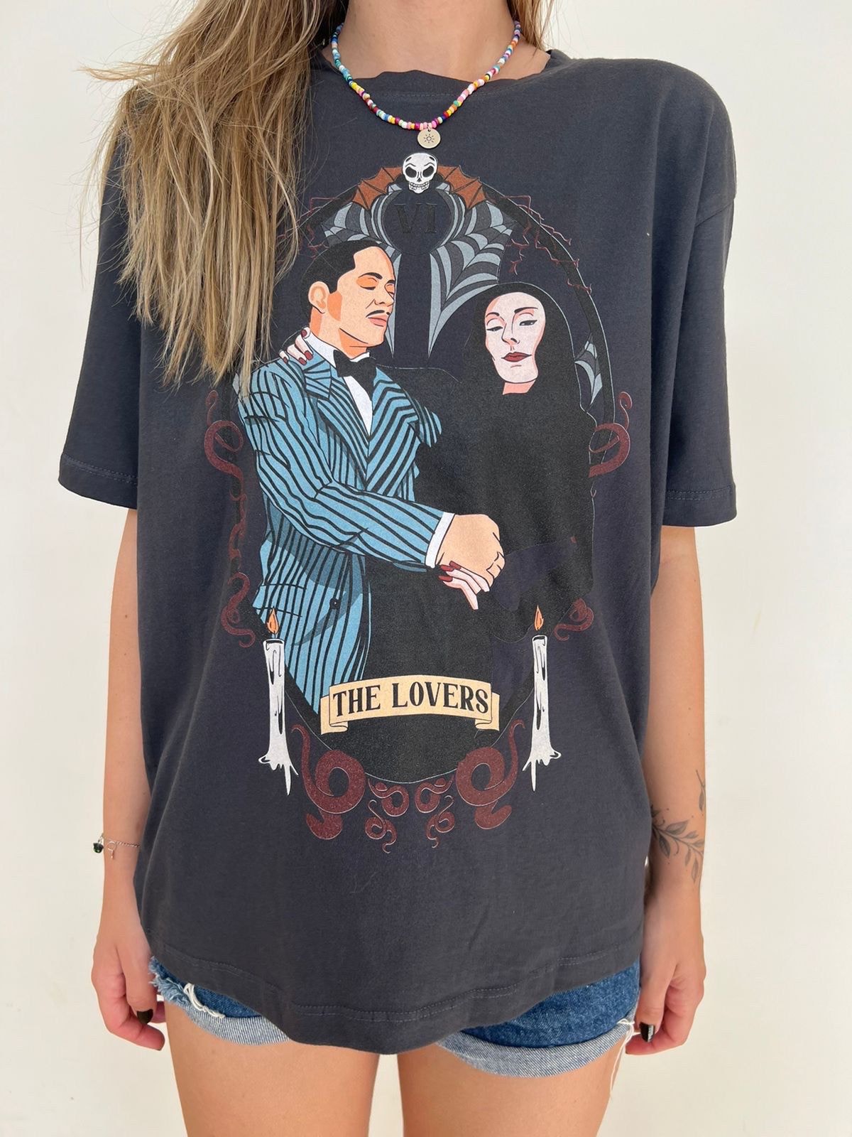 The Lovers: Para simbolizar esse amor tão único, representamos Mortícia e Gomez a partir da carta de tarot ‘Os Amantes’. Tirar esta carta em uma leitura de tarot revela que você tem uma conexão bela e profunda com alguém que significa muito para você. A carta também apresenta o parceiro como um espelho, refletindo aspectos mais profundos de nós e nos ajudando a nos tornarmos nós mesmos.