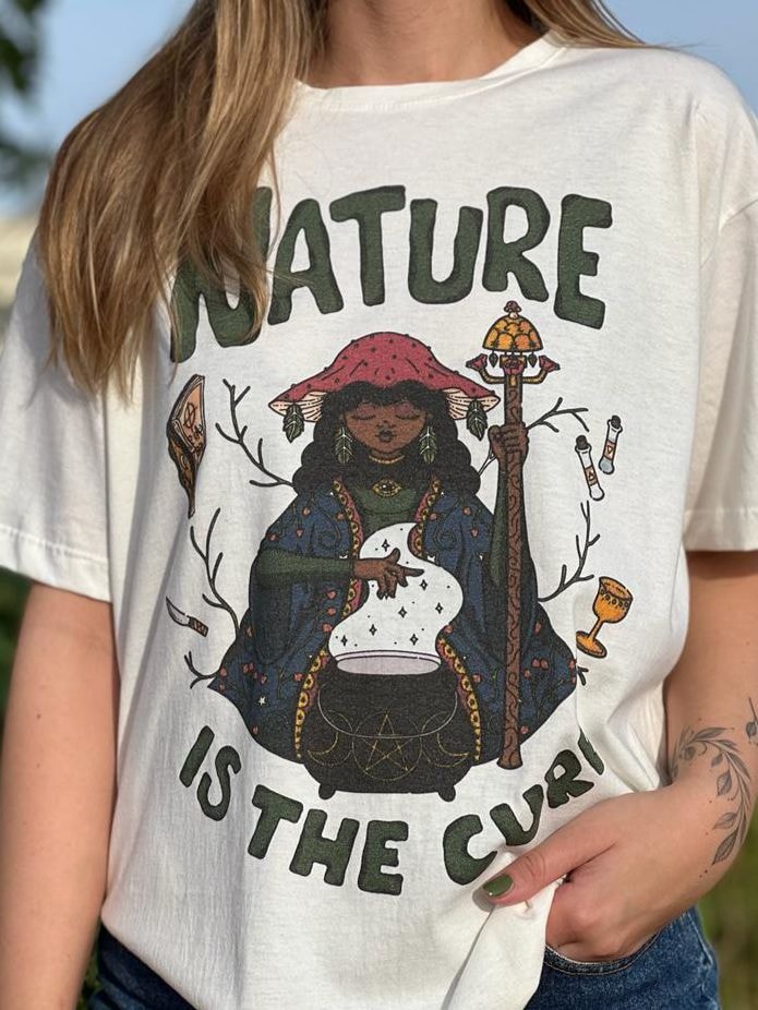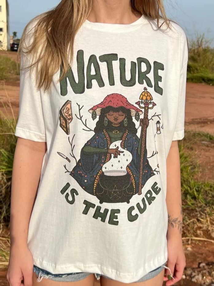 A camiseta Nature Is The Cure traz em sua estampa a imagem de uma bruxa fazendo magia com os encantos da natureza.