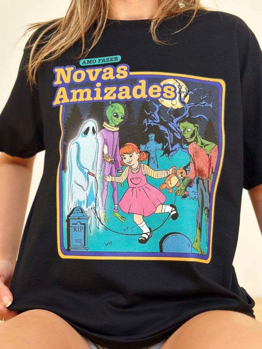 A camiseta 'Amo Fazer Novas Amizades' traz a cena mais inusitada do cemitério: uma menina saltitante pulando corda com um fantasma, um alienígena e um zumbi, tudo com muito humor e um toque vintage.
