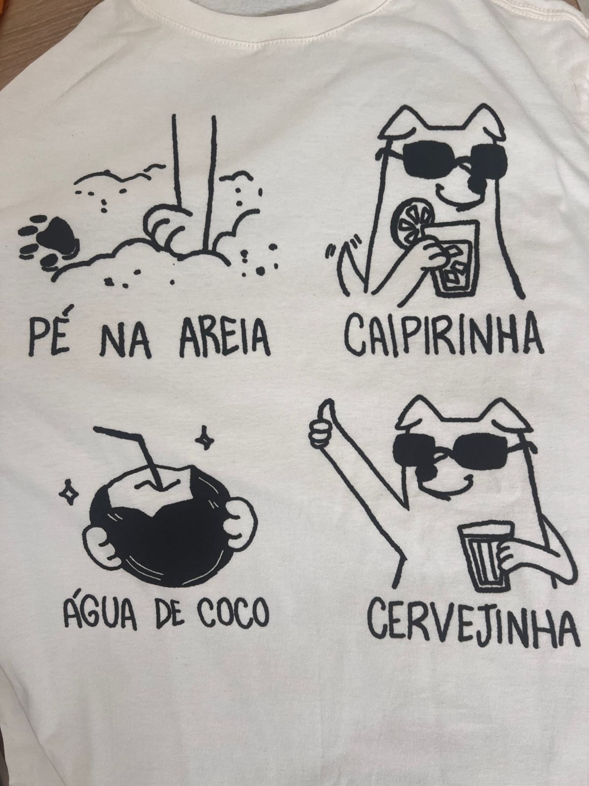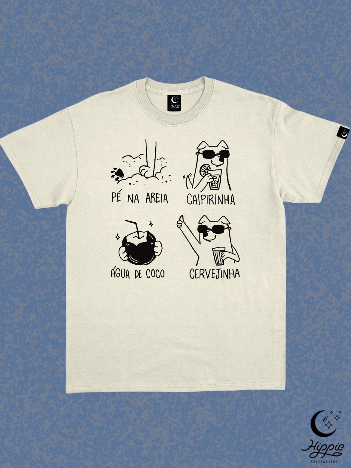 A camiseta Pé na Areia Cachorrinho traz nosso animal preferido ilustrando o verso que mais representa a energia brasileira: Pé na areia, capirinha, água de coco, cervejinha.