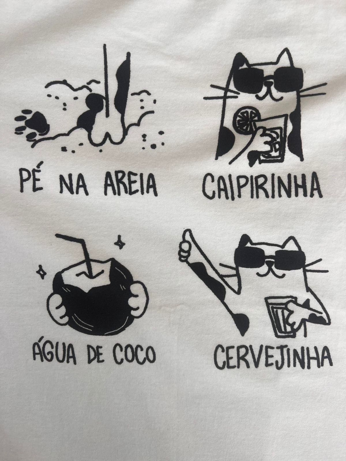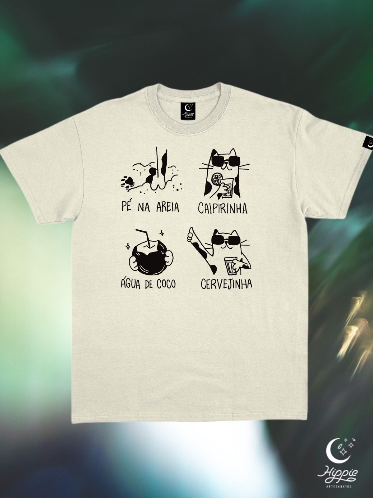 A camiseta Pé na Areia Gatinho traz nosso animal preferido ilustrando o verso que mais representa a energia brasileira: Pé na areia, caipirinha, água de coco, cervejinha.
