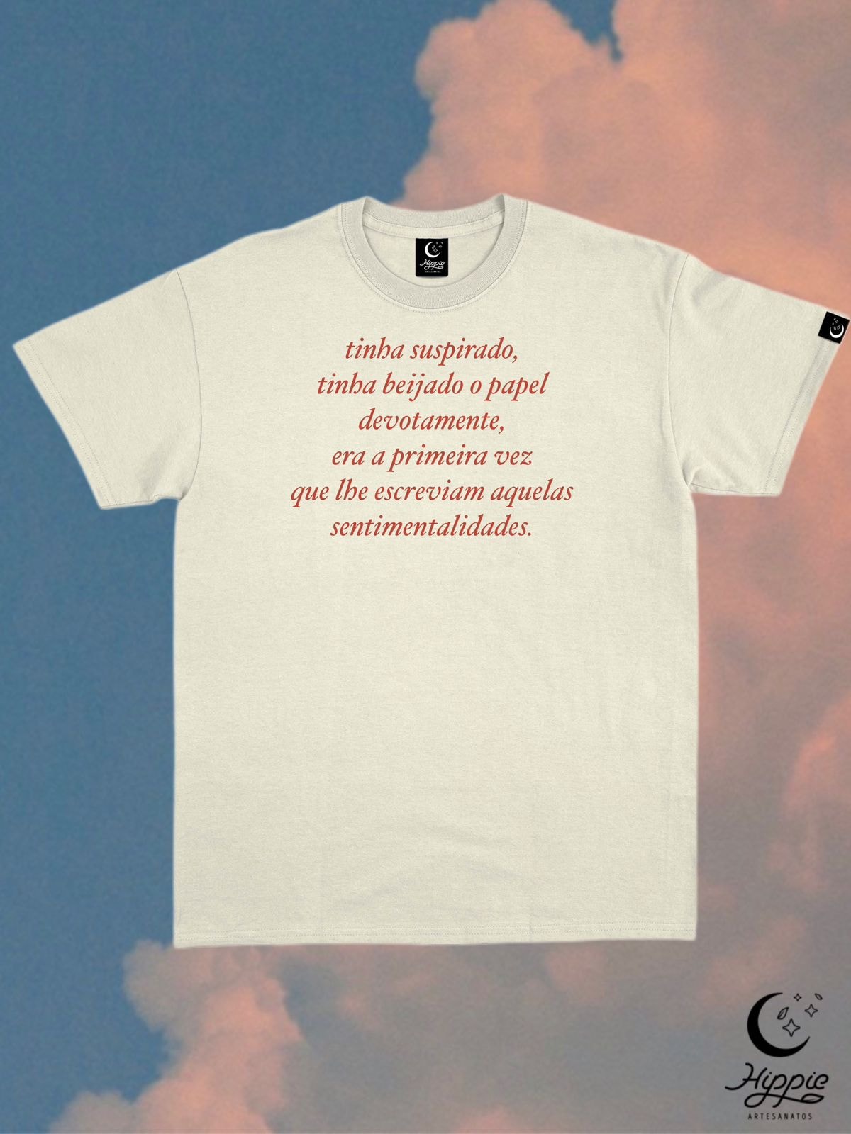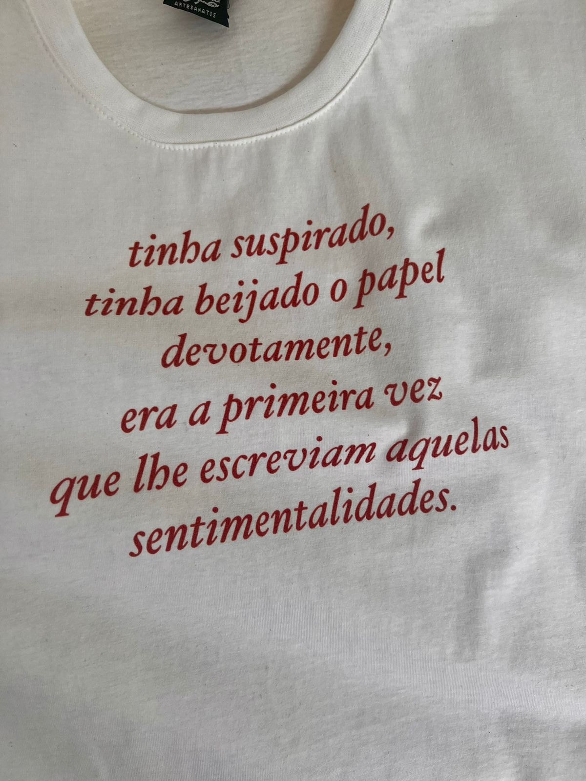 A camiseta Poesia Sol apresenta o trecho de uma carta de amor. A poesia é parte do romance ‘O Primo Basílio’, um clássico de Eça de Queiroz.