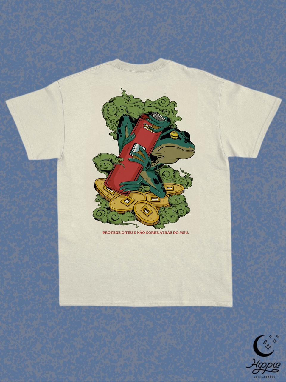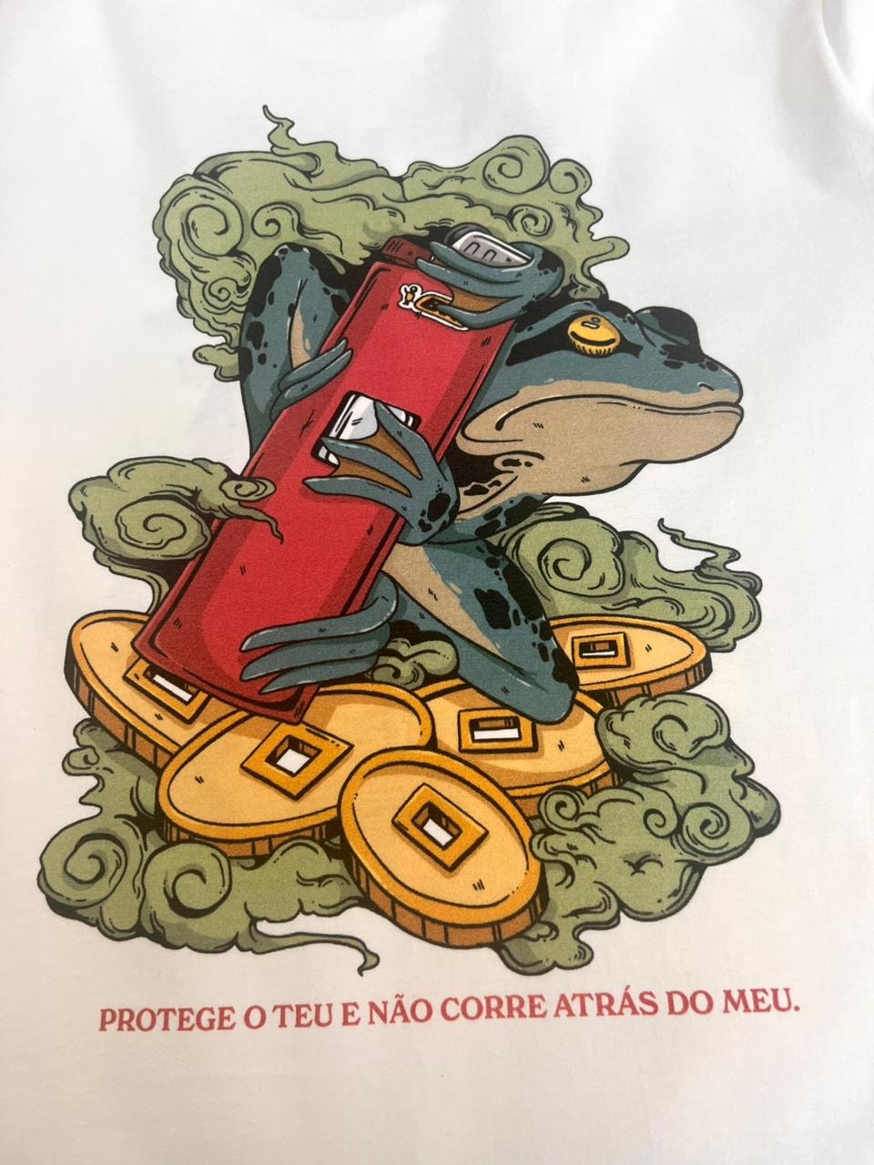 Nessa camiseta, o Sapo da Fortuna traz o recado: Protege o teu e não corre atrás do meu. Um incentivo a focar e ir atrás dos seus objetivos, sem se comparar ou se sentir ameaçado pelo progresso alheio.