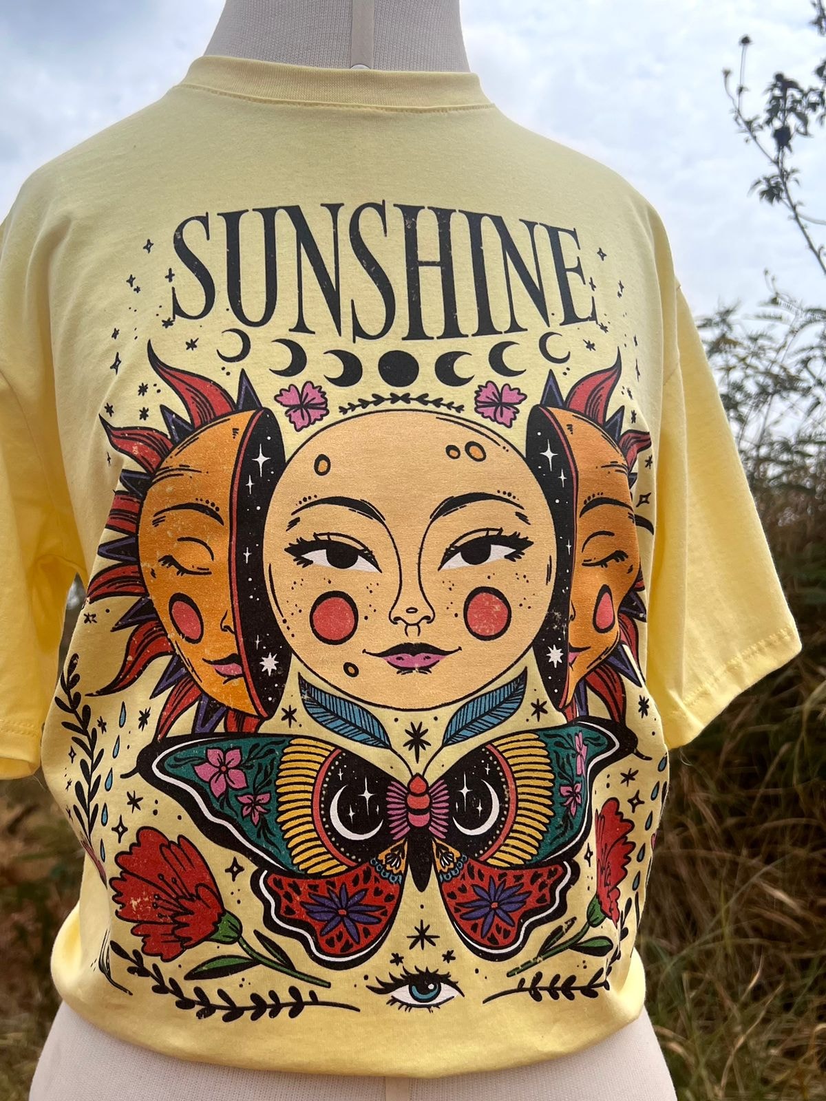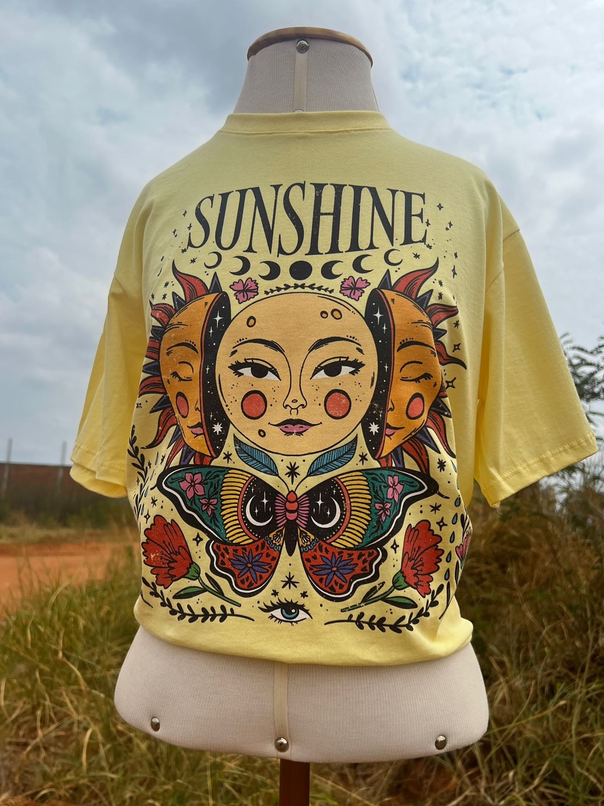 Sol é calor, energia de vida, luz. Os raios solares nos aquecem e influenciam em nossas emoções. A camiseta Sunshine tem um ar místico e também fala sobre dualidade.