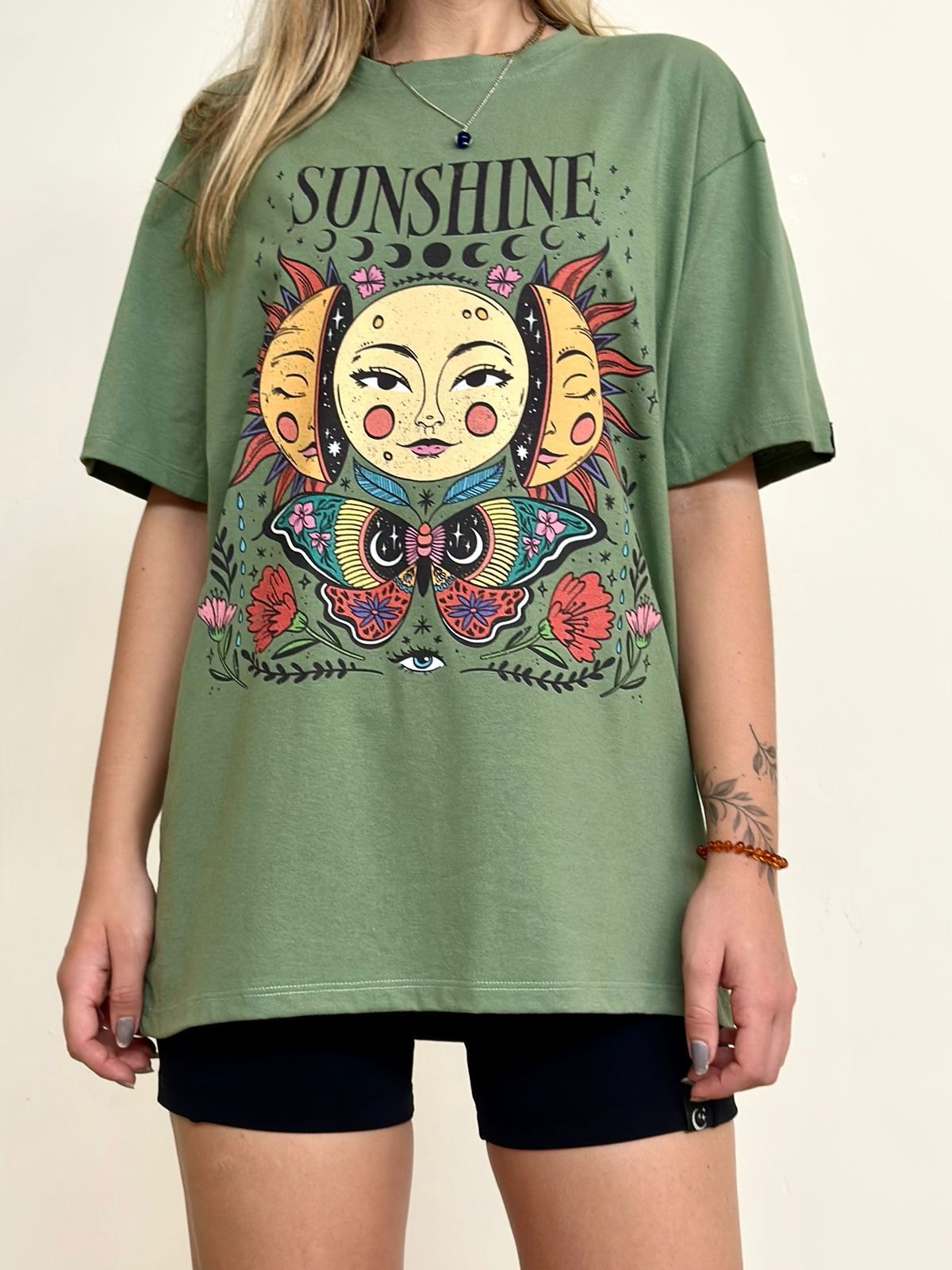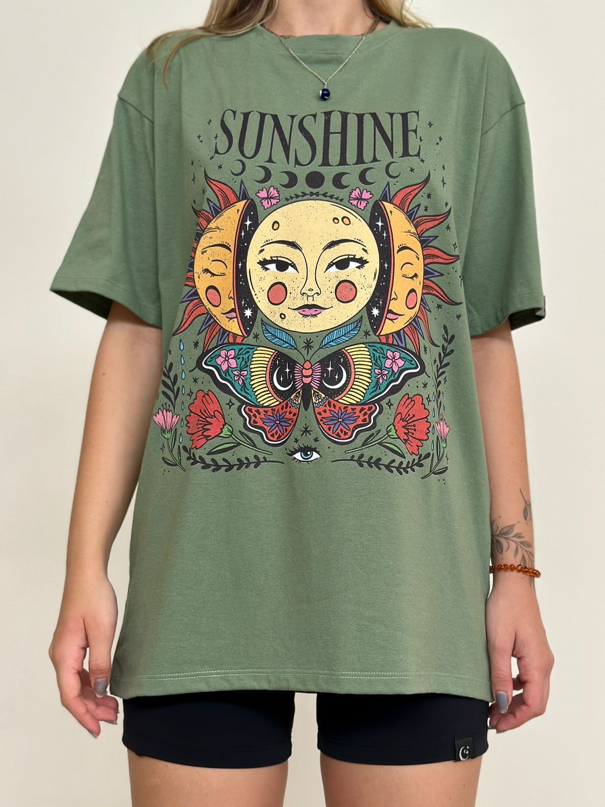 Sol é calor, energia de vida, luz. Os raios solares nos aquecem e influenciam em nossas emoções. A camiseta Sunshine tem um ar místico e também fala sobre dualidade.