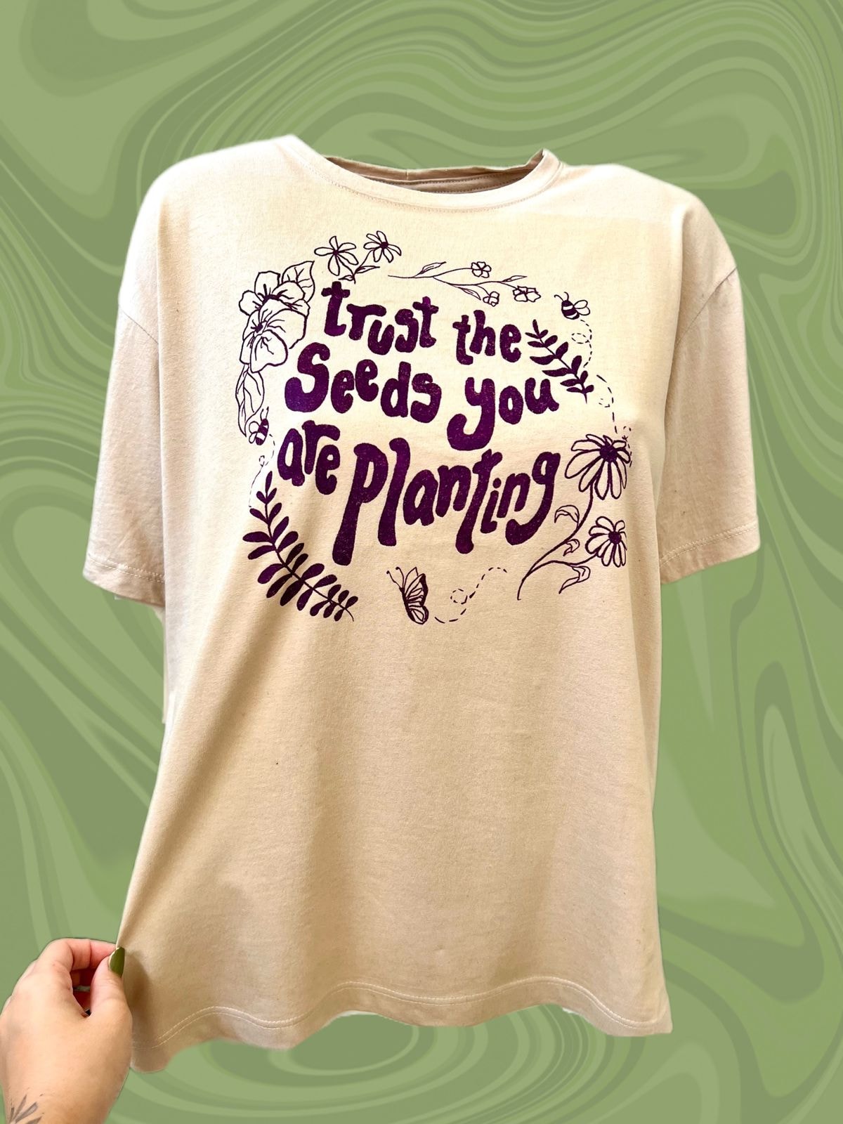 A camiseta Trust The Seeds You Are Planting é uma mensagem de inspiração e força para você manter seu foco e agir de acordo com seus valores.