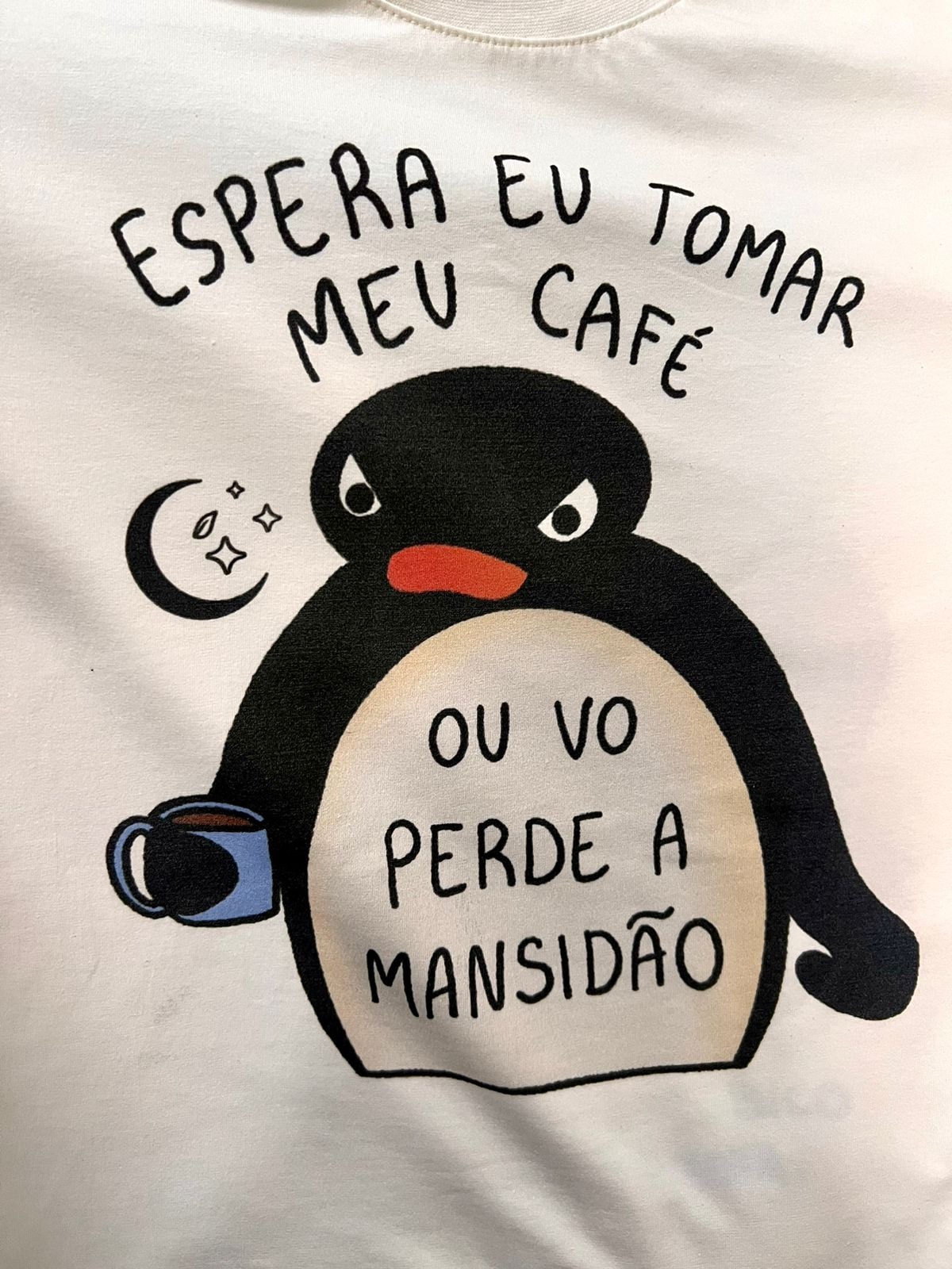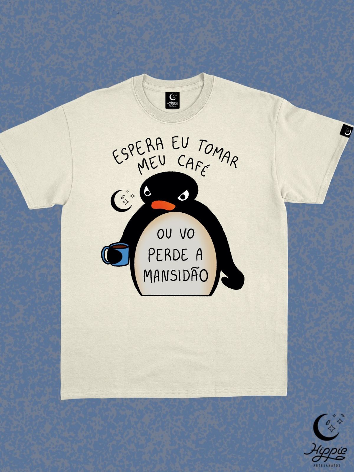 A camiseta Pingu Mansidão representa muito bem aquela pessoa para quem o dia só começa depois da primeira xícara de café.