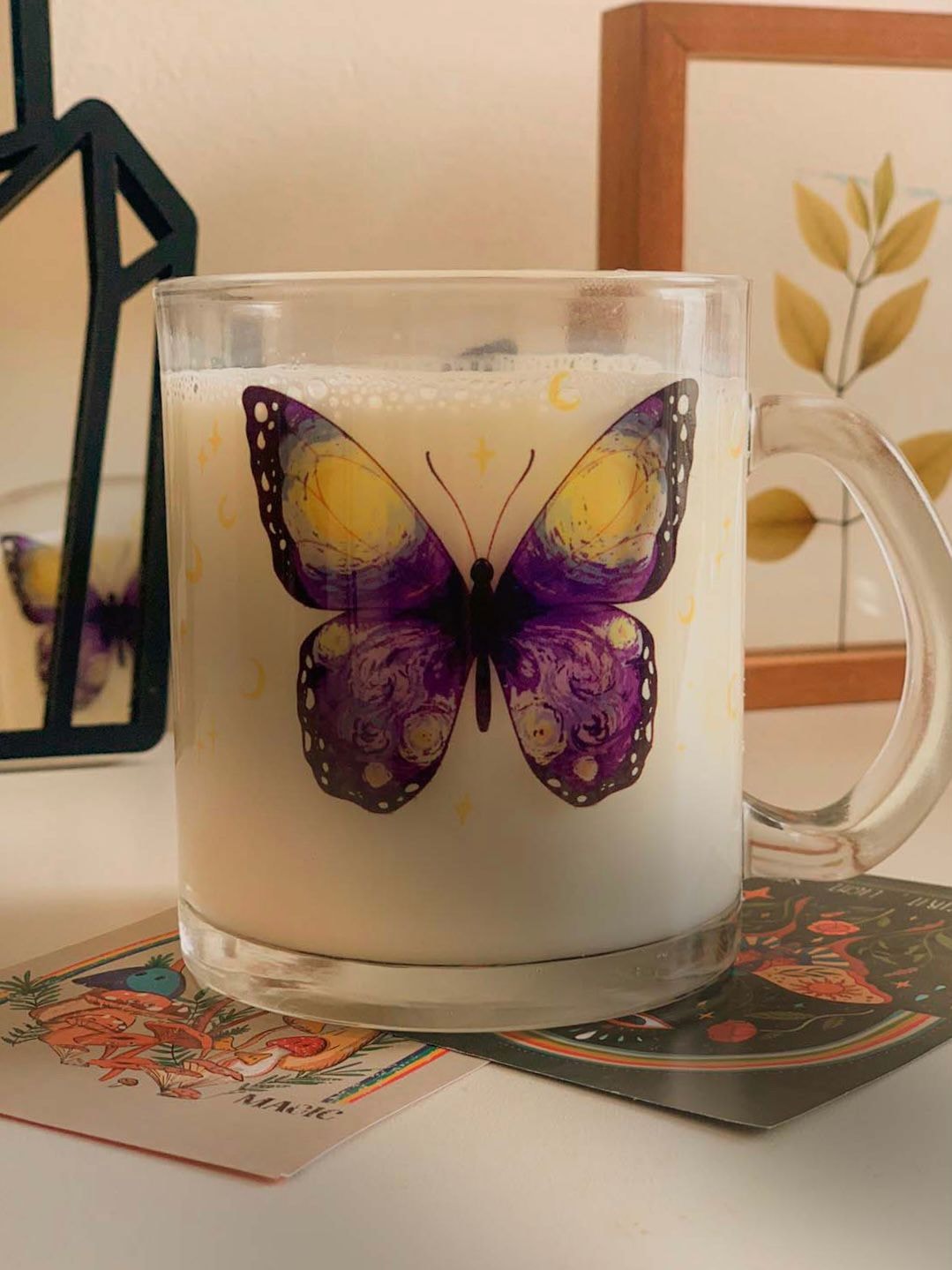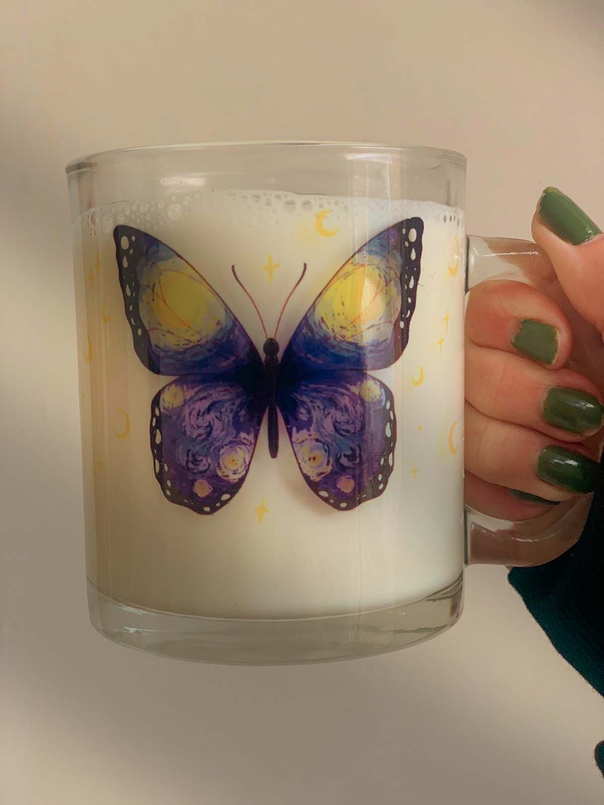 Essa caneca é ilustrada com uma borboleta estampada com uma releitura do quadro Noite Estrelada, de Van Gogh, que remete à profundidade e movimento.