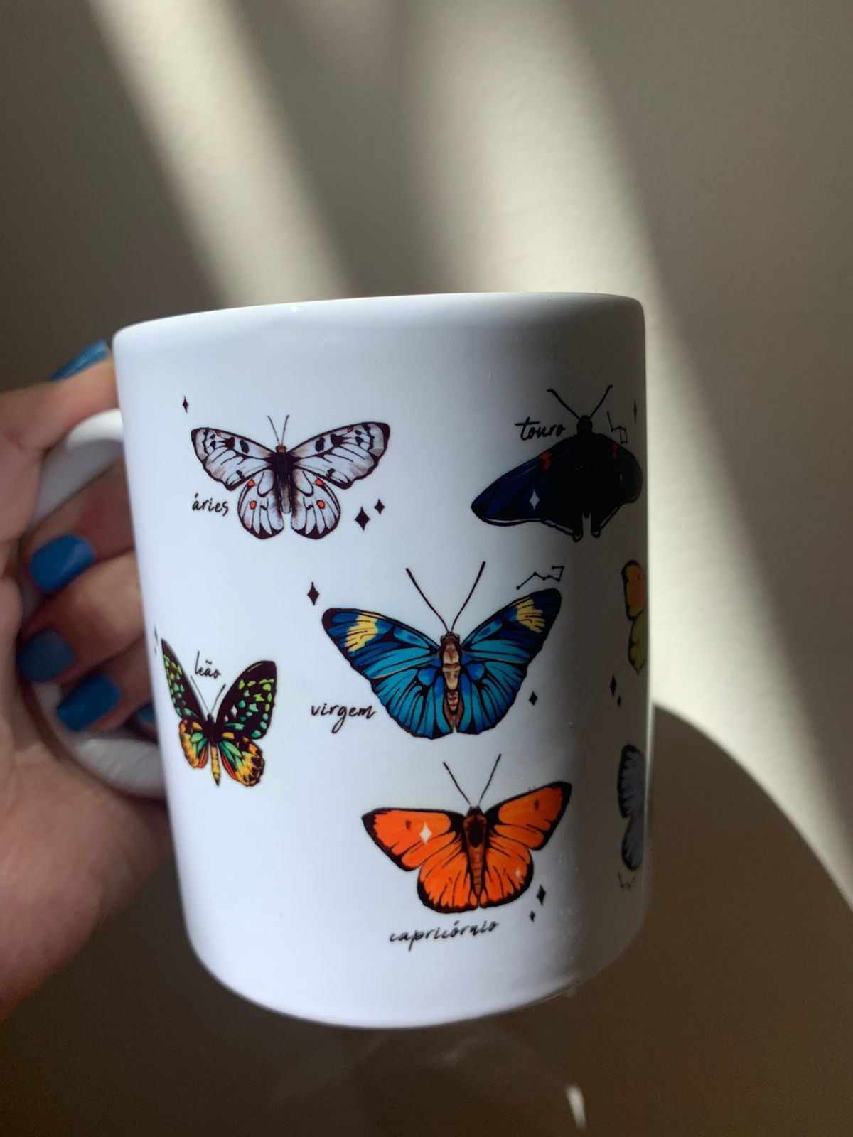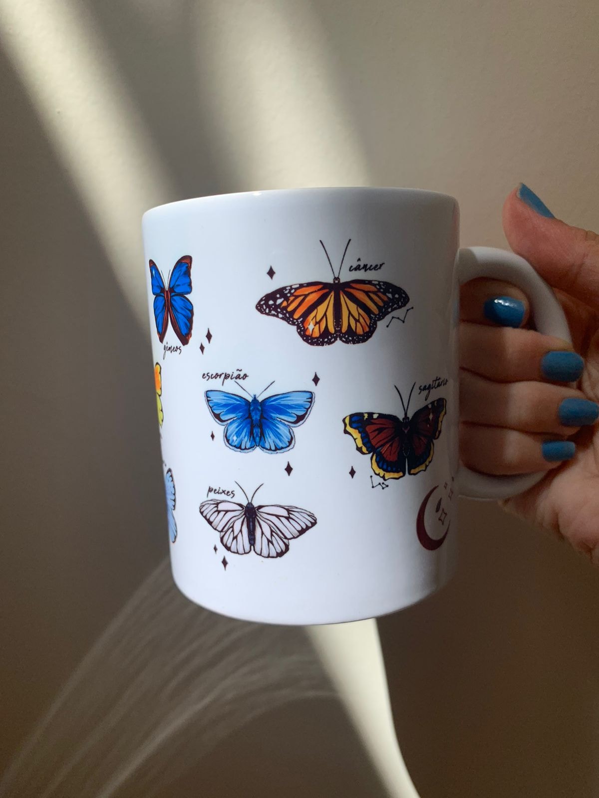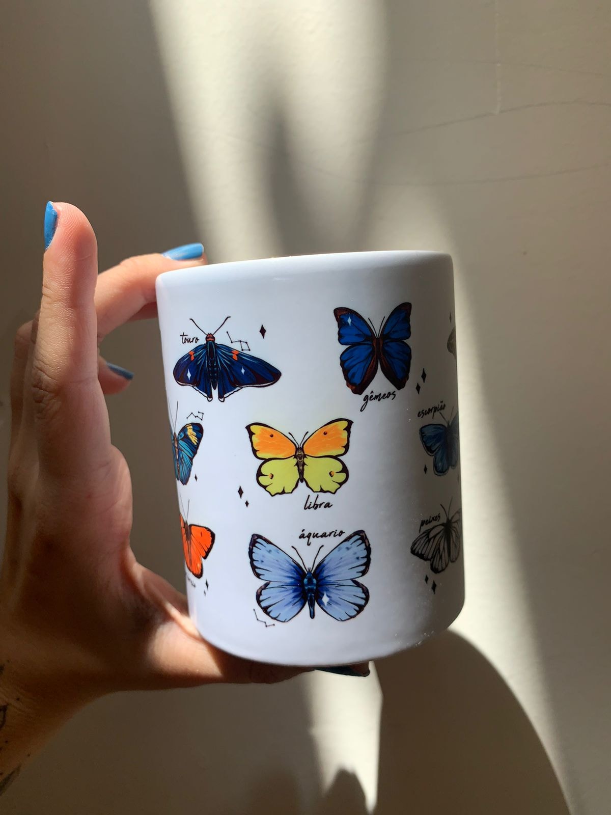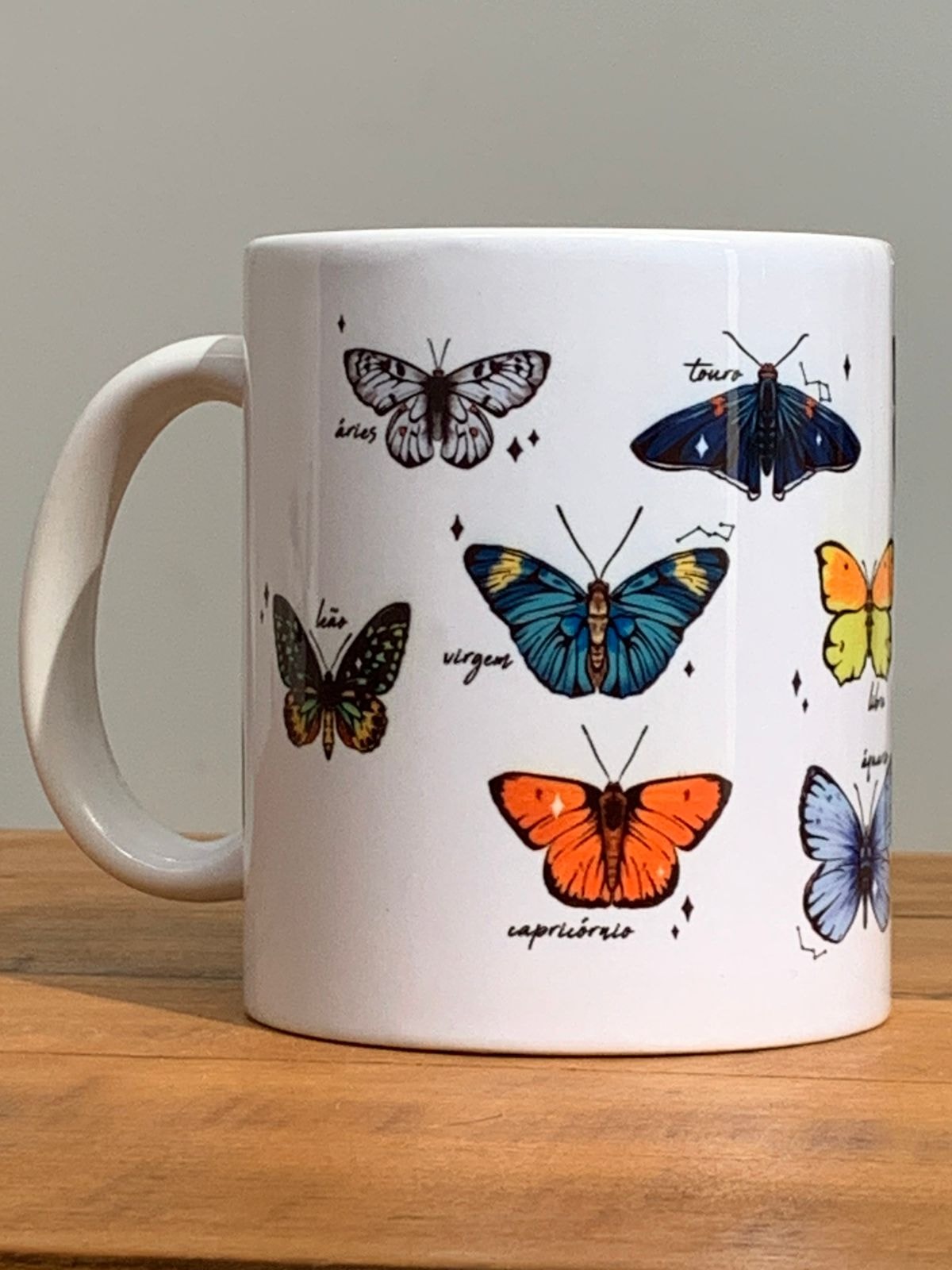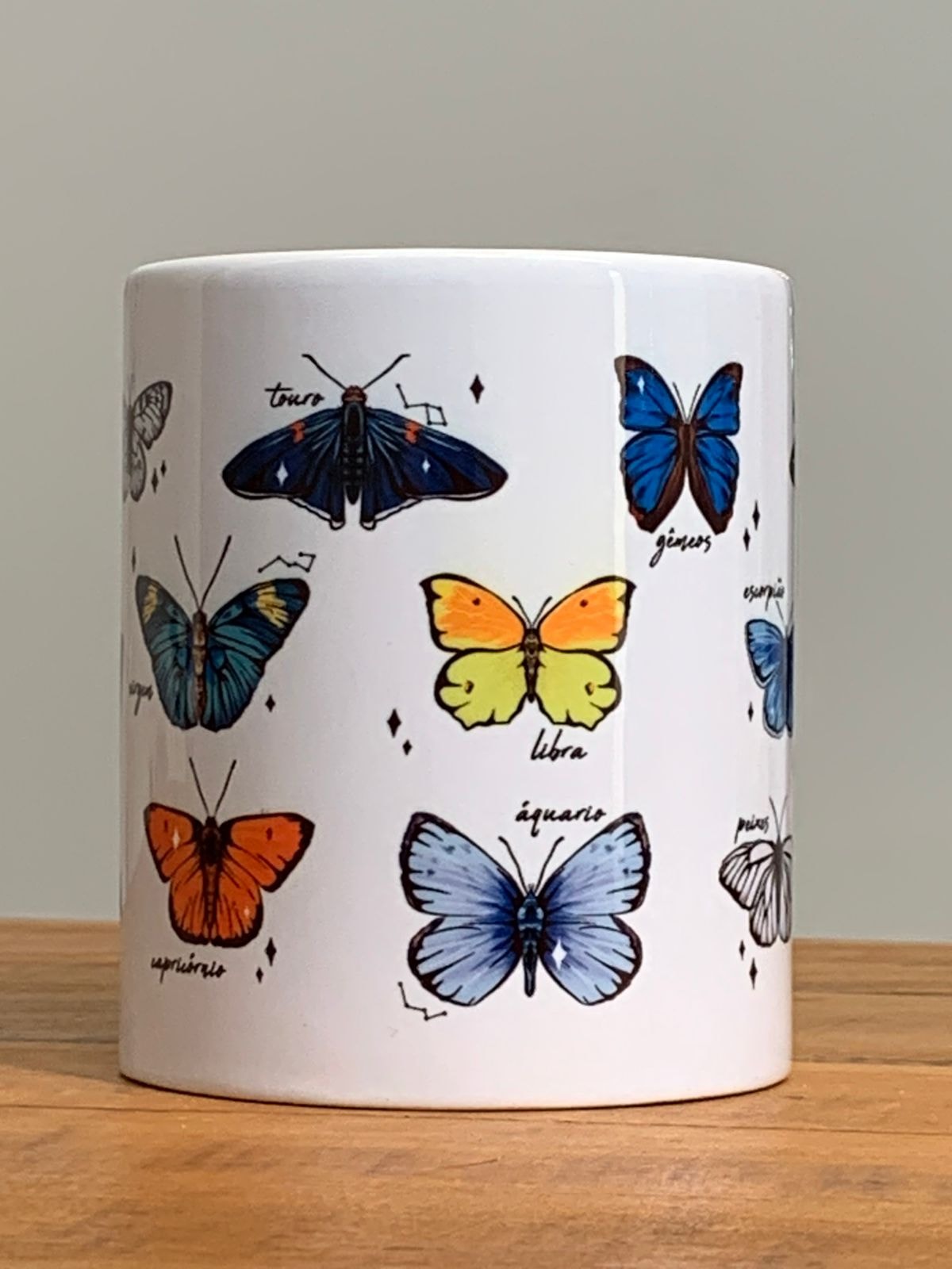 Borboletas são animais com simbologia profunda de transformação, renascimento e adaptação. Sua metamorfose é um ensinamento sobre o longo processo necessário para alcançarmos nosso máximo potencial. Reza a lenda que cada borboleta possui um significado próprio, a depender de suas cores. Na caneca Borboletas Astrais, reunimos as borboletas que representam cada signo do zodíaco.