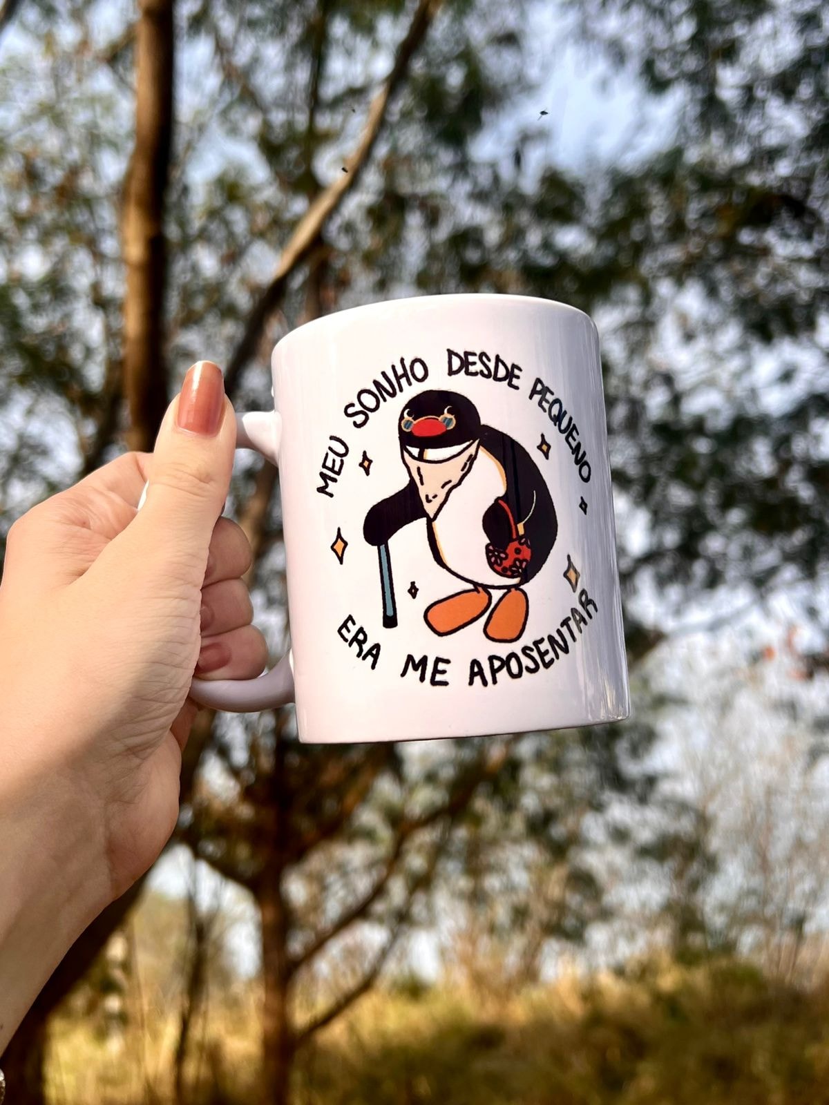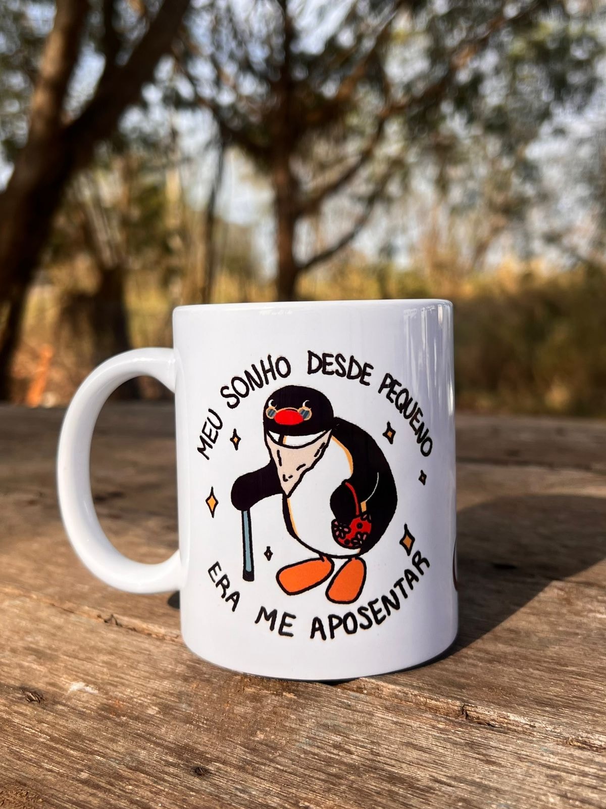 O Pingu Aposentado dessa caneca está vivendo o sonho: a vida de aposentado.