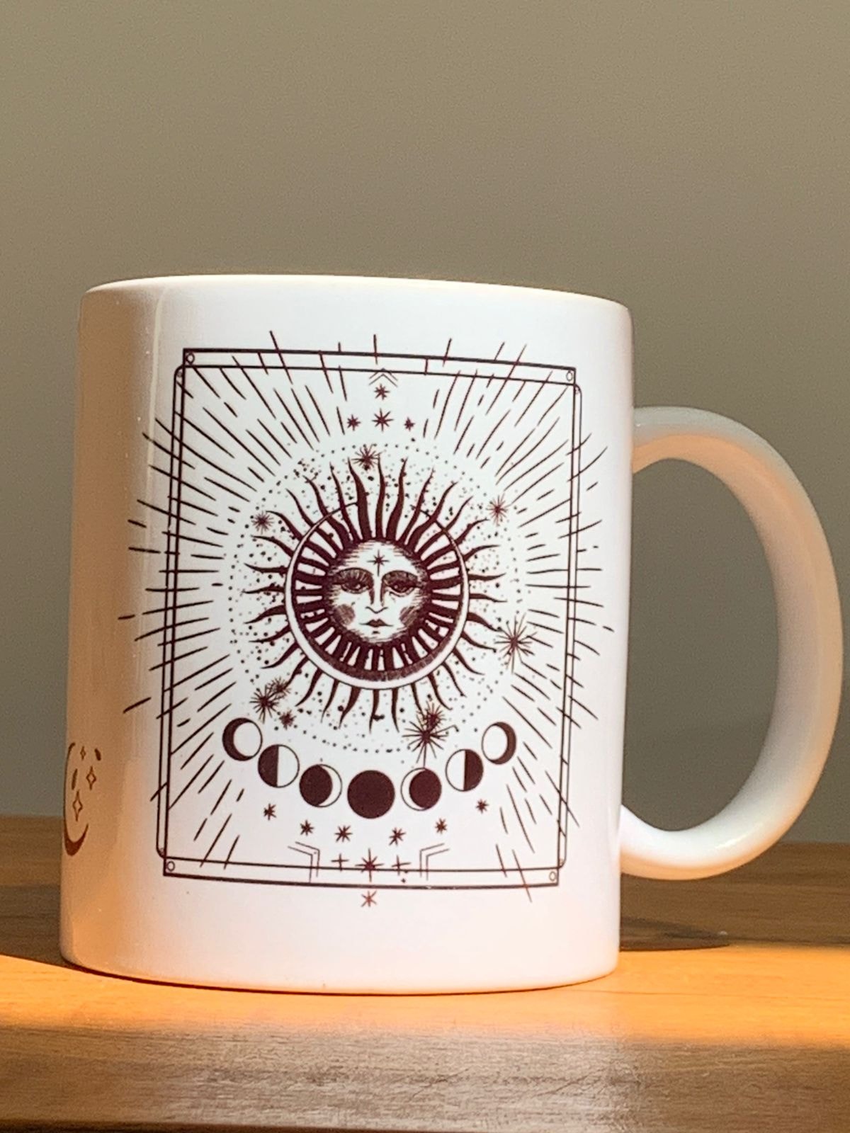 Sol: É o princípio masculino. Se conectar com as propriedades do sol é uma importante fonte de inspiração para que sejam construídas bases emocionais sólidas dentro de si. Lua: Como para tudo existe um oposto, a caneca Solar também representa a lua, simbolizando a importância do equilíbrio entre feminino e masculino, razão e emoção, luz e sombra. A lua fala sobre olhar para o nosso Eu interior e reconhecer nosso lado intuitivo e perceptivo.