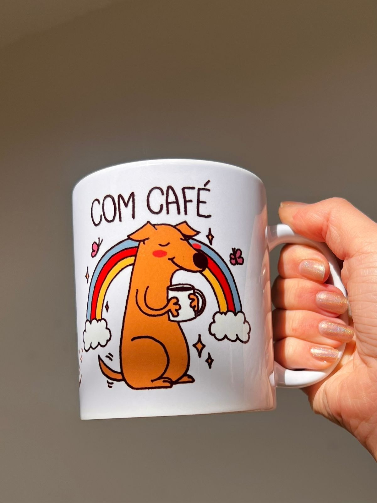 A caneca Vira Lata Com e Sem Café traz nossa raça de cachorro preferida representando nossos moods antes e depois de tomar a xícara de café matinal <3