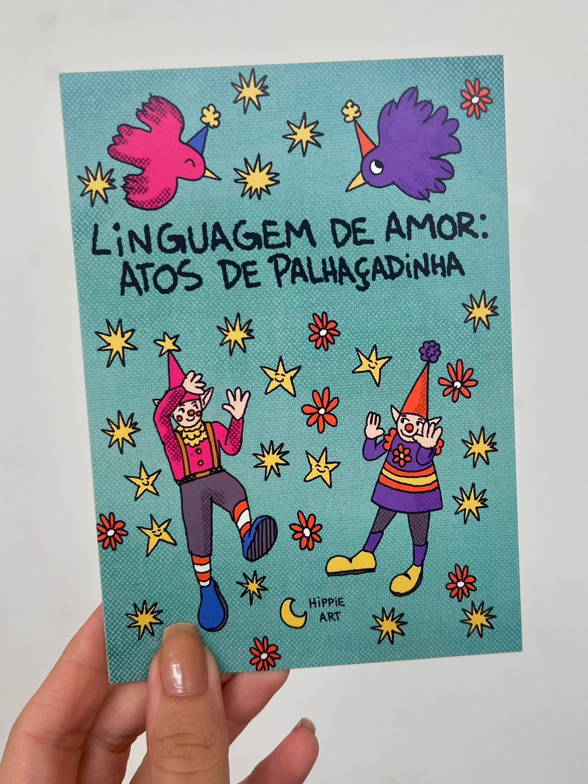Linguagem de amor: atos de palhaçadinha <3 Se sua forma de expressar amor é através de brincadeiras e risadas, significa que você faz tudo para ver a pessoa amada feliz e com o sorriso no rosto. Presentear com o cartão ‘Atos de Palhaçadinha’ é mostrar que o que mais importa para você é vê-la sempre leve, sorridente e de bem com a vida. Porque, no fim, alegria verdadeira é alegria compartilhada.